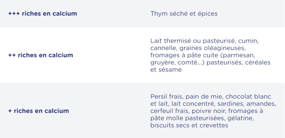 Durant la grossesse, vos besoins en minéraux ainsi que ceux de votre bébé augmentent. C’est pourquoi il est recommandé d’augmenter ses apports en calcium grâce aux aliments riches en calcium : au moins 3 produits laitiers par jour. Cela correspond, par exemple, à un yaourt, un fromage blanc battu, une portion de fromage ou un verre de lait. Évitez cependant le lait cru et les produits à base de lait cru, c’est-à-dire non cuits durant le processus de fabrication ou non pasteurisés, ou thermisé (chauffés à une température entre 57° et 68° pendant 15s). Les eaux minérales riches en calcium peuvent également contribuer à satisfaire vos besoins en calcium.