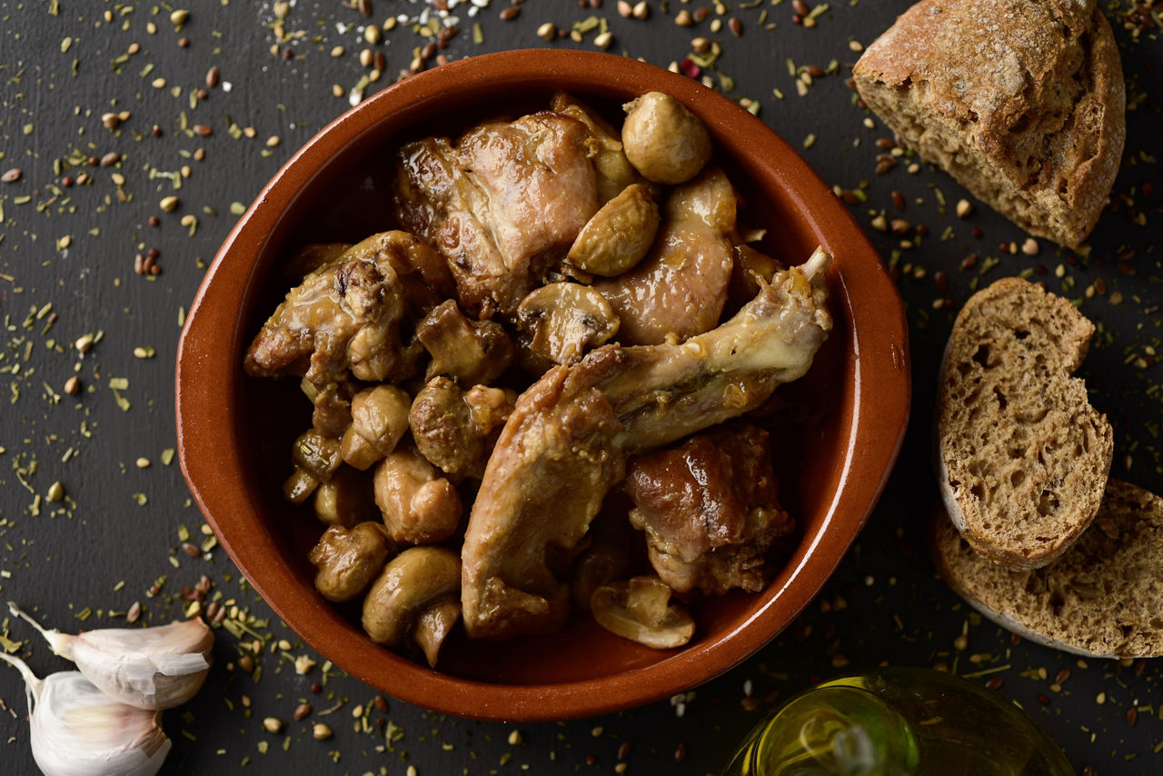 4- Sur une feuille de papier sulfurisé, disposez la cuisse de lapin, les échalotes, les champignons et la crème.