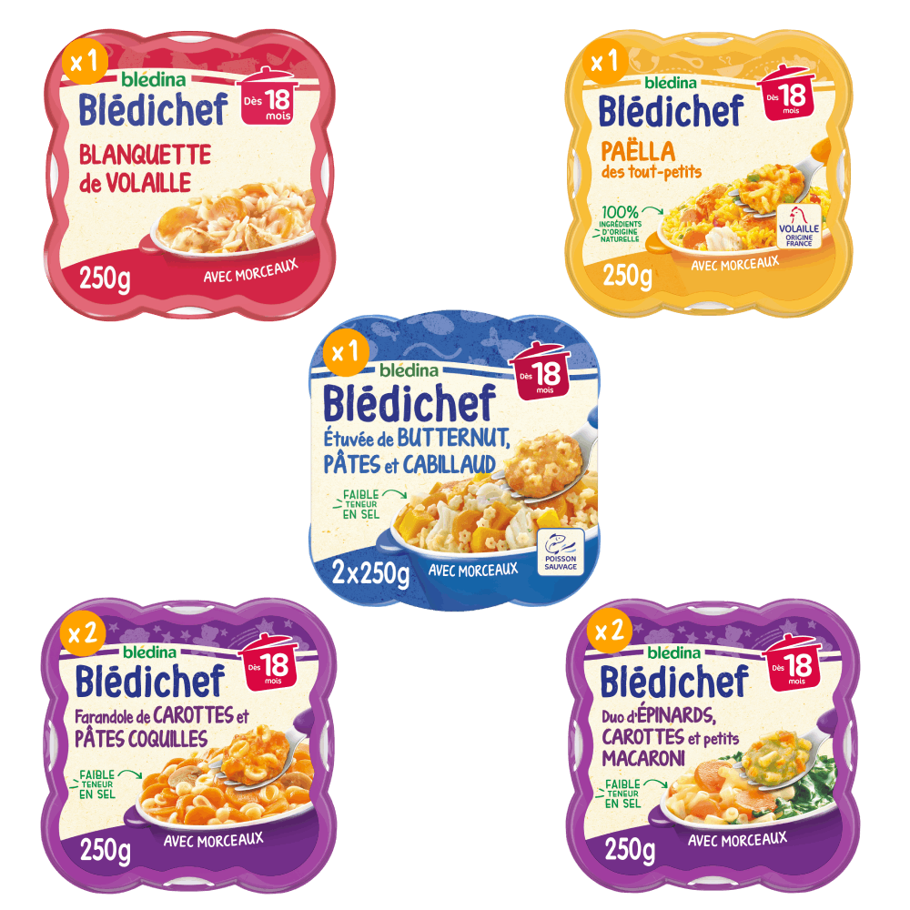 Découvrez de notre gamme Blédichef midi nos petits plats favoris dès 12 mois, dans un nouveau format de 8 assiettes. Des plats de grands adaptés par notre chef pour les tout-petits, avec des petits morceaux, le tout dans une assiette facile à transporter.