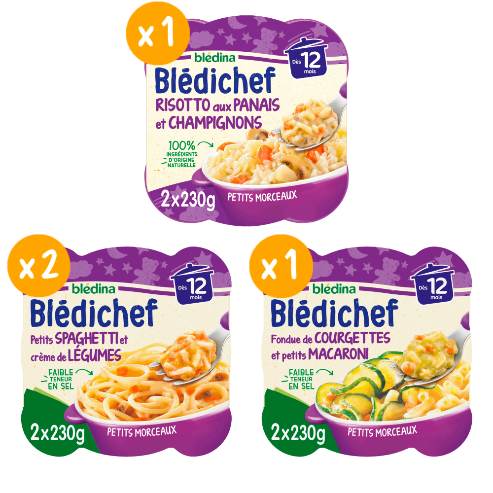 Découvrez, dans un nouveau format de 8 assiettes, nos petits plats favoris de notre gamme Blédichef midi dès 12 mois. Des plats  adaptés par notre chef pour les tout-petits, avec des petits morceaux, le tout dans une assiette facile à transporter.