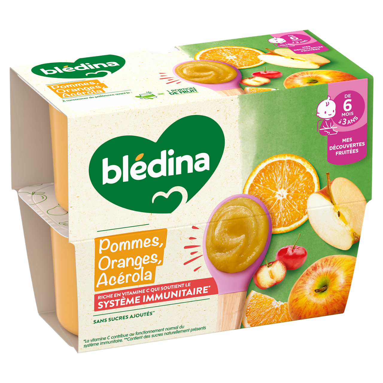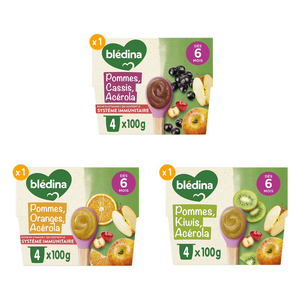 Les nouvelles recettes de la gamme des purées de fruits, naturellement riches en vitamine C qui contribue au fonctionnement normal du système immunitaire*. Faites découvrir à bébé des mélanges de fruits gourmands et inédits, pour éveiller les papilles de bébé. Riche en vitamine C qui soutient le système immunitaire* Sans sucres ajoutés : contient les sucres naturels des fruits Sans résidus de pesticides : taux inférieurs à 0,000001%, conformément aux règles de l'alimentation infantile. Plus de 15 recettes de purées de fruits à découvrir, élaborées par nos nutritionnistes et cuisinées en France à Brive la Gaillarde et parfaitement adaptées à l'âge de bébé (conformément à la réglementation de l'alimentation infantile). ⠀⠀⠀⠀⠀⠀⠀⠀⠀ Ce lot contient 12 coupelles : 1x Coupelles Pomme Oranges Acérola (4x100g) 1x Coupelles Pomme Cassis Acérola (4x100g) 1x Coupelles Pomme Kiwi Acérola (4x100g) *La vitamine C contribue au fonctionnement normal du système immunitaire