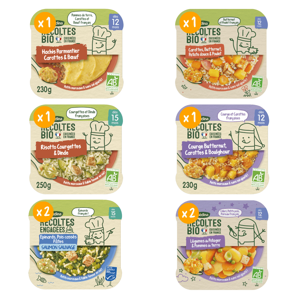 Retrouvez nos petits plats favoris de notre gamme Les Récoltes Bio midi et soir pour 12 et 15 mois, dans un nouveau format de 8 assiettes. Des petits plats bio pour continuer à régaler bébé, avec des petits morceaux. Découvrez nos petits plats Les Récoltes Bio & Engagées pour régaler bébé avec des assiettes à base de légumes, viande et poisson. A déguster au déjeuner et au dîner dès 12 et 15 mois. Les Récoltes Bio : composées d'ingrédients issus de l'Agriculture Biologique, nos plats Les Récoltes Bio sont mitonnés avec 80% de fruits, légumes, viandes et lait bio français. Engagés pour un avenir plus bio, nous accompagnons durablement les agriculteurs dans leur conversion au bio. Les Récoltes Engagées : composées d'ingrédients des recettes mitonnées avec du poisson sauvage péché en pleine mer et issu de la pêche durable, selon le référentiel MSC. C'est pourquoi il ne peut être certifié bio. Comme nos Récoltes Bio, les légumes de ces recettes engagées sont issus de l'Agriculture biologique. Ce lot contient 8 assiettes de 230g ou 250g chacune: 2 x Les Récoltes Bio - Légumes du potager et Pommes de terre (1x230g) 1 x Les Récoltes Bio - Carottes, Butternut, Patates douces et Poulet (1x230g) 2 x Les Récoltes Engagées - Epinards Pois cassés Saumon & Pâtes (1x250g) 1 x Les Récoltes Bio - Courge, Butternut, Carottes & Boulghour (1 x 230g) 1 x Les Récoltes Bio - Risotto Courgettes & Dinde (1 x 250g) 1 x Hachis Parmentier, Carottes & Bœuf (1 x230g)