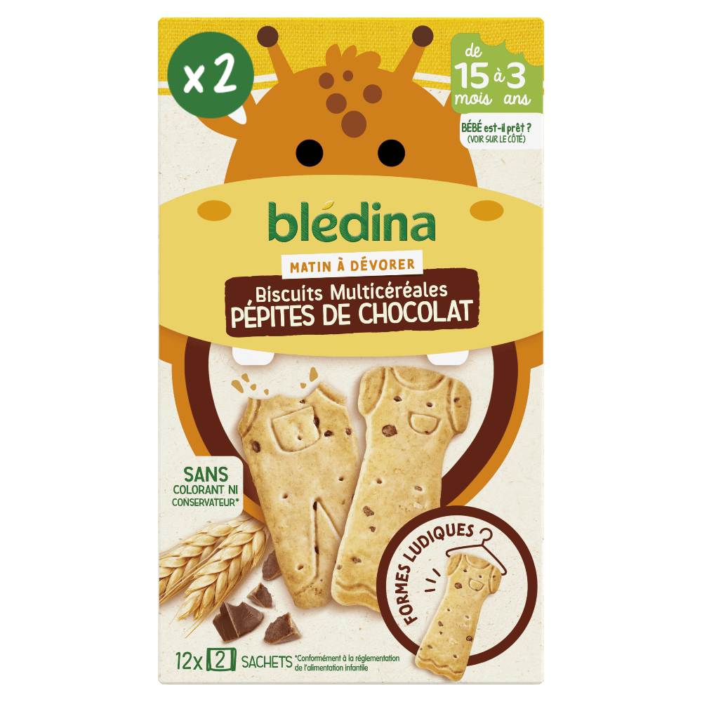 Découvrez les biscuits Mini Matin, une recette gourmande, source de fibres avec du blé complet, des flocons d’avoines et des pépites de chocolat, spécialement conçu pour les bébés à partir de 15 mois (se référer ci-dessous aux détails des informations du produit pour savoir si bébé est prêt). Sa texture, croquante puis fondante en bouche, avec des petits flocons d’avoine, accompagnera bébé dans la découverte de nouvelles textures.   Sans huile de palme Source de fibres 5 formes ludiques pour apprendre à reconnaître les vêtements Un format pratique à transporter et conserver Lot de 2 packs contenant chacun 12 sachets de 2 biscuits.