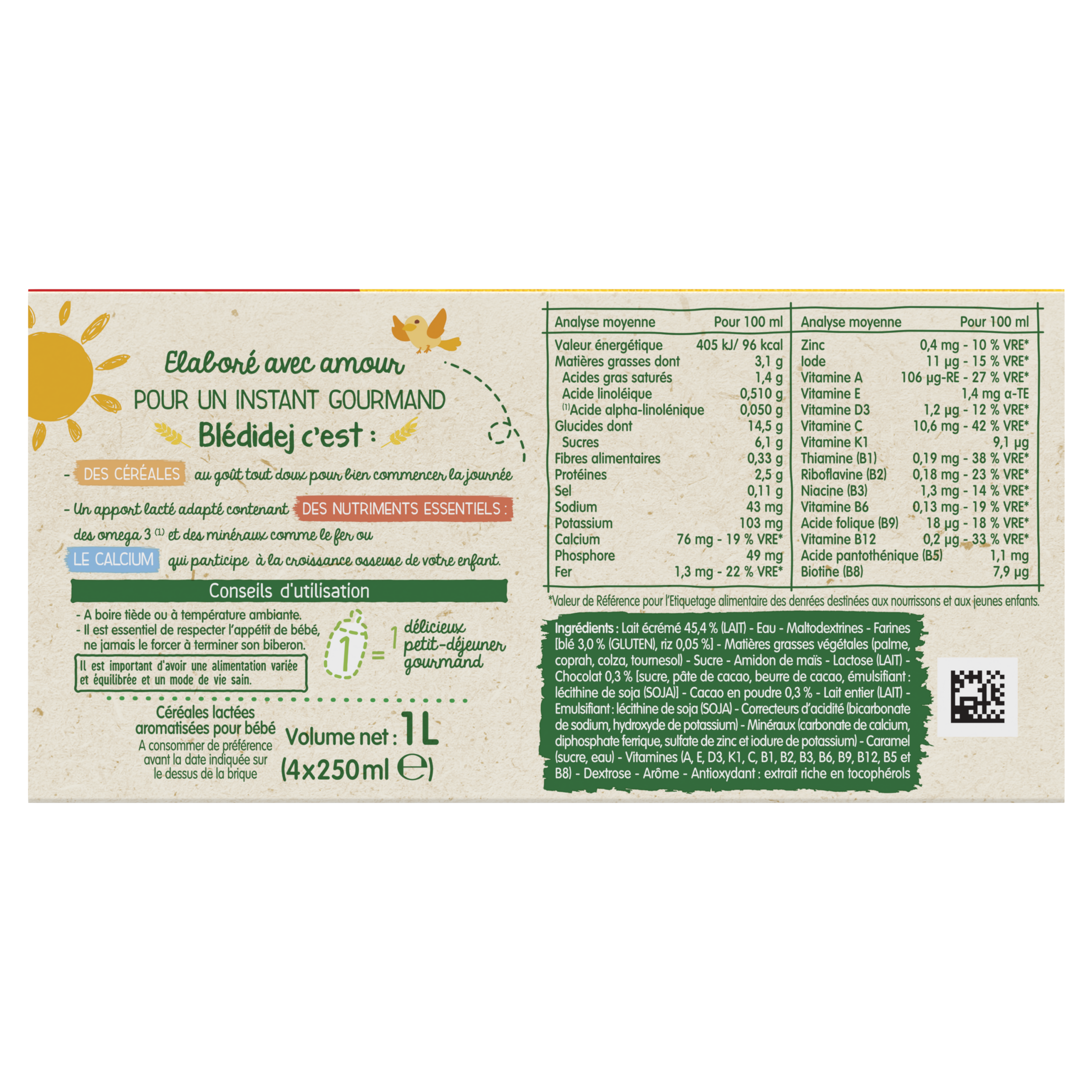 Blédidej, ce sont de délicieuses céréales lactées au goût tout doux et à la texture onctueuse pour bien commencer la journée ! Découvrez Blédidej Croissance Choco-Biscuité dès 12 mois, pour un petit-déjeuner complet et équilibré mêlant les saveurs gourmandes du chocolat et du biscuit.   Un format brique pratique à emmener partout 1 brique = 1 biberon Lot de 3 packs contenant chacun 4 briques de 250mL.