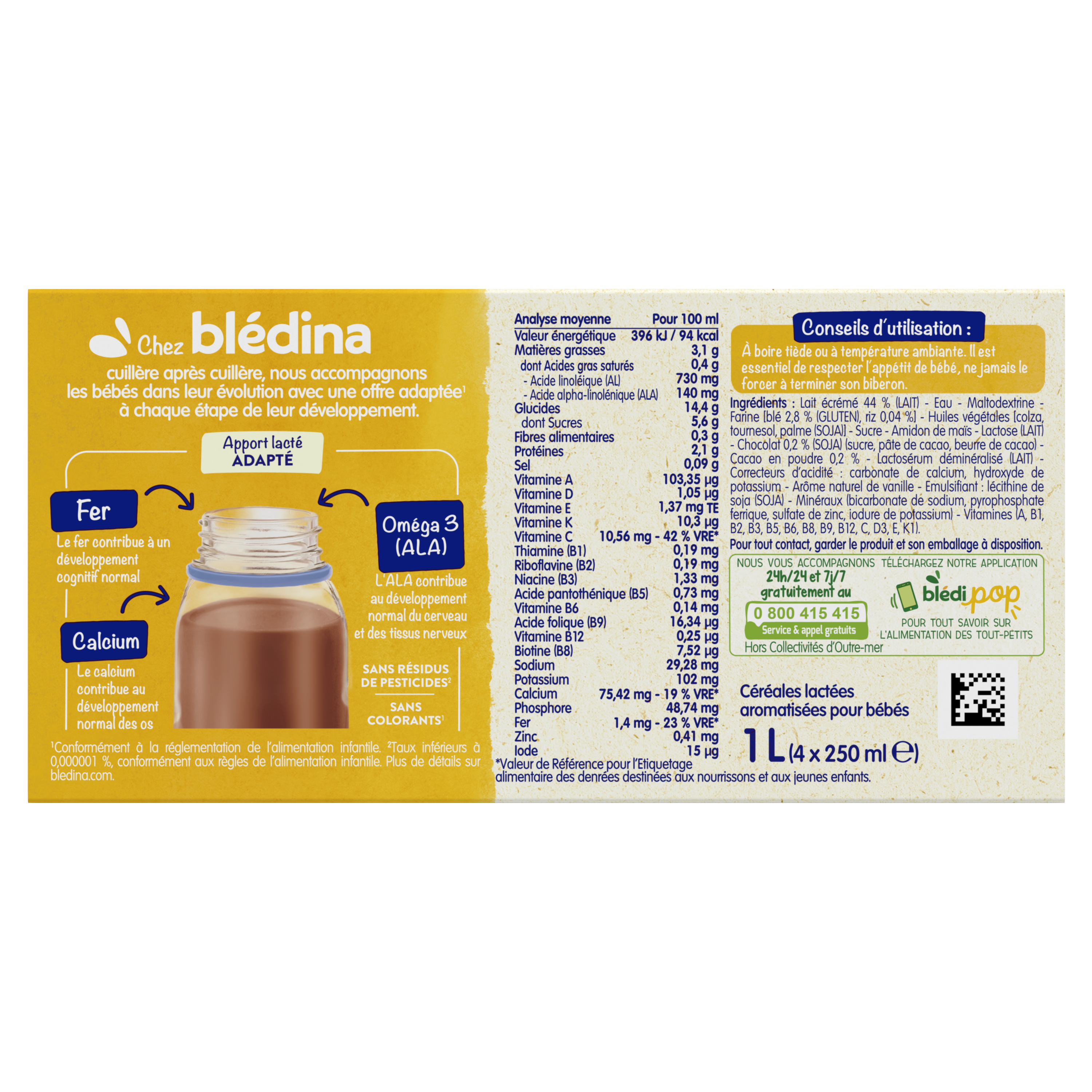 Blédidej, ce sont de délicieuses céréales lactées au goût tout doux et à la texture onctueuse pour bien commencer la journée ! Découvrez Blédidej Croissance Choco-Vanille dès 12 mois, pour un petit-déjeuner complet et équilibré mêlant les saveurs gourmandes du chocolat et de la vanille.   Un format brique pratique à emmener partout 1 brique = 1 biberon Lot de 3 packs contenant chacun 4 briques de 250mL.