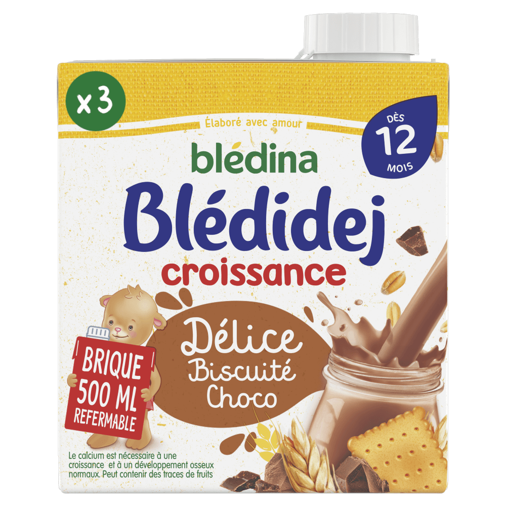 Blédidej, ce sont de délicieuses céréales lactées au goût tout doux et à la texture onctueuse pour bien commencer la journée ! Découvrez Blédidej Délice Biscuité Choco dès 12 mois, pour un petit-déjeuner complet et équilibré alliant les saveurs gourmandes du biscuit et du chocolat.   Un format brique pratique à emmener partout Bouchon refermable 1 brique = 2 biberons Lot de 3 briques de 500 mL chacune.