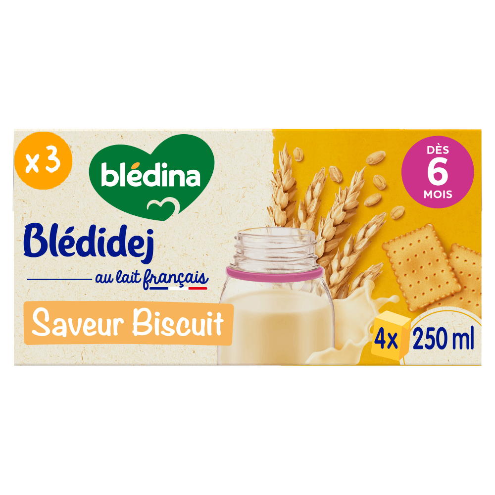Blédidej, ce sont de délicieuses céréales lactées au goût tout doux et à la texture onctueuse pour bien commencer la journée ! Découvrez Blédidej Saveur Biscuit pour un petit-déjeuner complet et équilibré à la saveur gourmande du biscuit dès 6 mois.   Un format brique pratique à emmener partout 1 brique = 1 biberon  Lot de 3 packs contenant chacun 4 briques de 250mL.