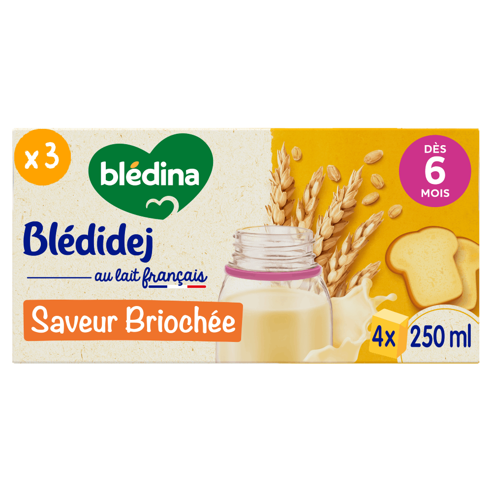 Blédidej, ce sont de délicieuses céréales lactées au goût tout doux et à la texture onctueuse pour bien commencer la journée ! Découvrez Blédidej Saveur Briochée pour un petit-déjeuner complet et équilibré à la saveur gourmande de la brioche dès 6 mois.   Un format brique pratique à emmener partout 1 brique = 1 biberon = 225 ml d’apport lacté adapté par brique Lot de 3 packs contenant chacun 4 briques de 250mL.