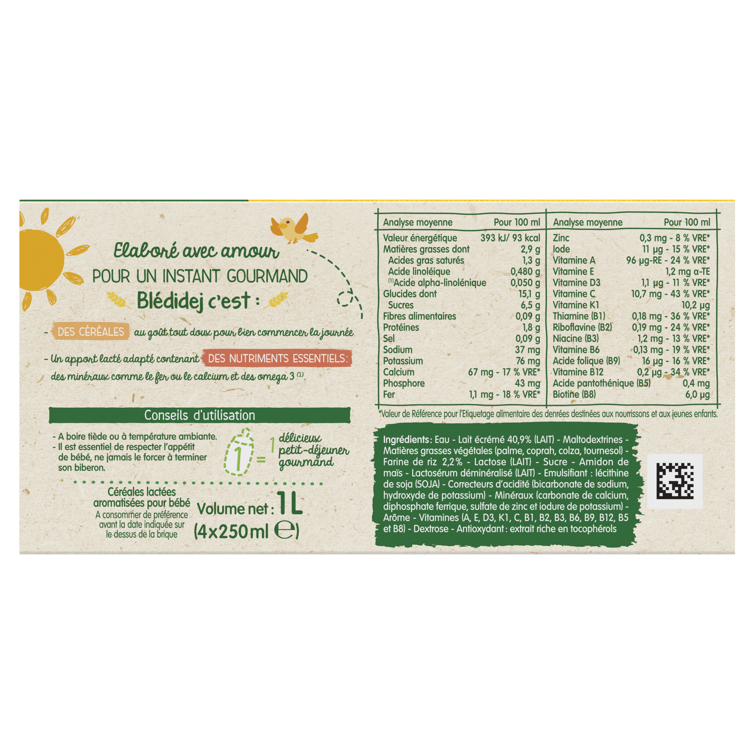 Blédidej, ce sont de délicieuses céréales lactées au goût tout doux et à la texture onctueuse pour bien commencer la journée ! Découvrez Blédidej saveur Vanille dès 6 mois, pour un petit-déjeuner complet et équilibré à la douce saveur de la vanille.   Un format brique pratique à emmener partout 1 brique = 1 biberon Lot de 3 packs contenant chacun 4 briques de 250mL.