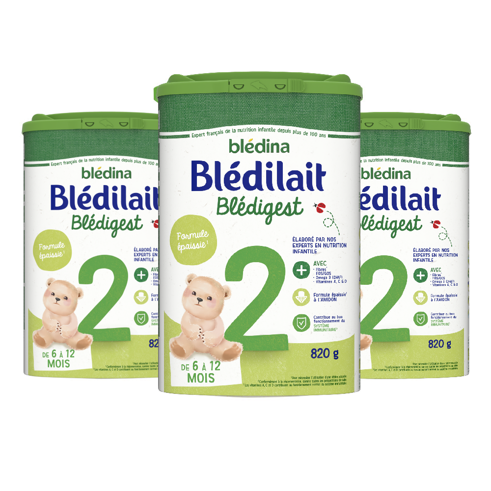 Découvrez Blédigest 2 qui accompagne votre bébé pas à pas, tout naturellement. Blédigest 2 est une formule infantile épaissie (1) à l'amidon développée par nos experts en nutrition avec tout ce dont bébé a besoin (2) ! ⠀⠀⠀⠀⠀⠀⠀ Accompagne bébé de ses 6 mois jusqu'à 1 an, dans le cadre d'une alimentation diversifiée. Contribue à répondre aux besoins nutritionnels spécifiques du bébé Fabriqué conformément à la réglementation Formule de lait épaissie ⠀⠀⠀⠀⠀⠀⠀⠀ (1) Peut nécessiter l'utilisation d'une tétine adaptée. (2) Conformément à la réglementation, comme toutes les préparations de suite.⠀⠀⠀⠀⠀⠀⠀⠀ Avis important : Le lait maternel est l’aliment idéal et naturel du nourrisson : il est le mieux adapté à ses besoins spécifiques.⠀⠀ ⠀⠀⠀⠀⠀⠀⠀⠀⠀⠀⠀⠀⠀⠀⠀⠀ Lot de 3 boîtes x 820g