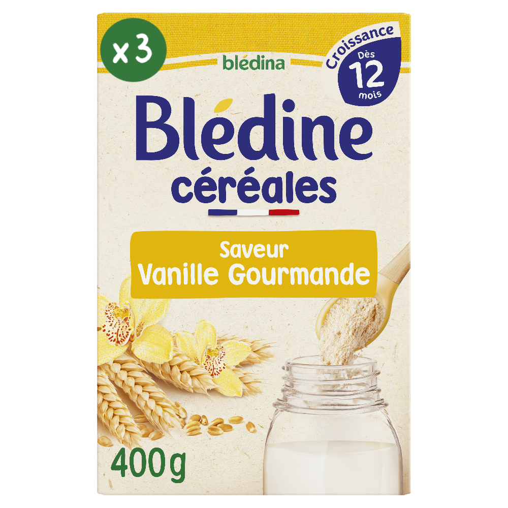 INFORMATION CONSOMMATEUR - RAPPEL PRODUIT La qualité de nos produits étant notre priorité, nous avons décidé de procéder au rappel de 2 lots de BLEDINE Céréales saveur Vanille Gourmande dès 12 mois format 400g portant les DDM suivantes : 11/09/2026 - 12/09/2026 Nous vous invitons donc à ne pas consommer les produits concernés par ce rappel, non conforme à une limite réglementaire, et à contacter notre service consommateur en cas de doute au 0800 415 15. Des investigations sont en cours pour identifier l’origine de l’incident et mettre en place les mesures nécessaires pour éviter que cela ne se reproduise. Nous prions nos consommateurs de bien vouloir nous excuser pour la gêne occasionnée. Experts en nutrition infantile et inventeurs des céréales pour bébé, nous avons à cœur de proposer des recettes adaptées* aux besoins et au petit palais de bébé. Nous avons fait le choix de limiter drastiquement la quantité de sucres présente dans nos recettes et ça ne passe pas inaperçu. C'est un goût toujours doux et plus délicat, une couleur plus claire, une odeur gourmande plus subtile et une texture plus généreuse. La Blédine® régale les bébés depuis plus de 100 ans et ce n'est pas prêt de changer. La Blédine® a été inventée par 2 pharmaciens Léon Jacquemaire et Maurine Miguet en 1906. La Blédine® est élaborée en France dans notre usine historique de Villefranche-sur-Saône. Lot de 3 packs contenant chacun 400g de préparation. *Conformément à la réglementaire de l'alimentation infantile