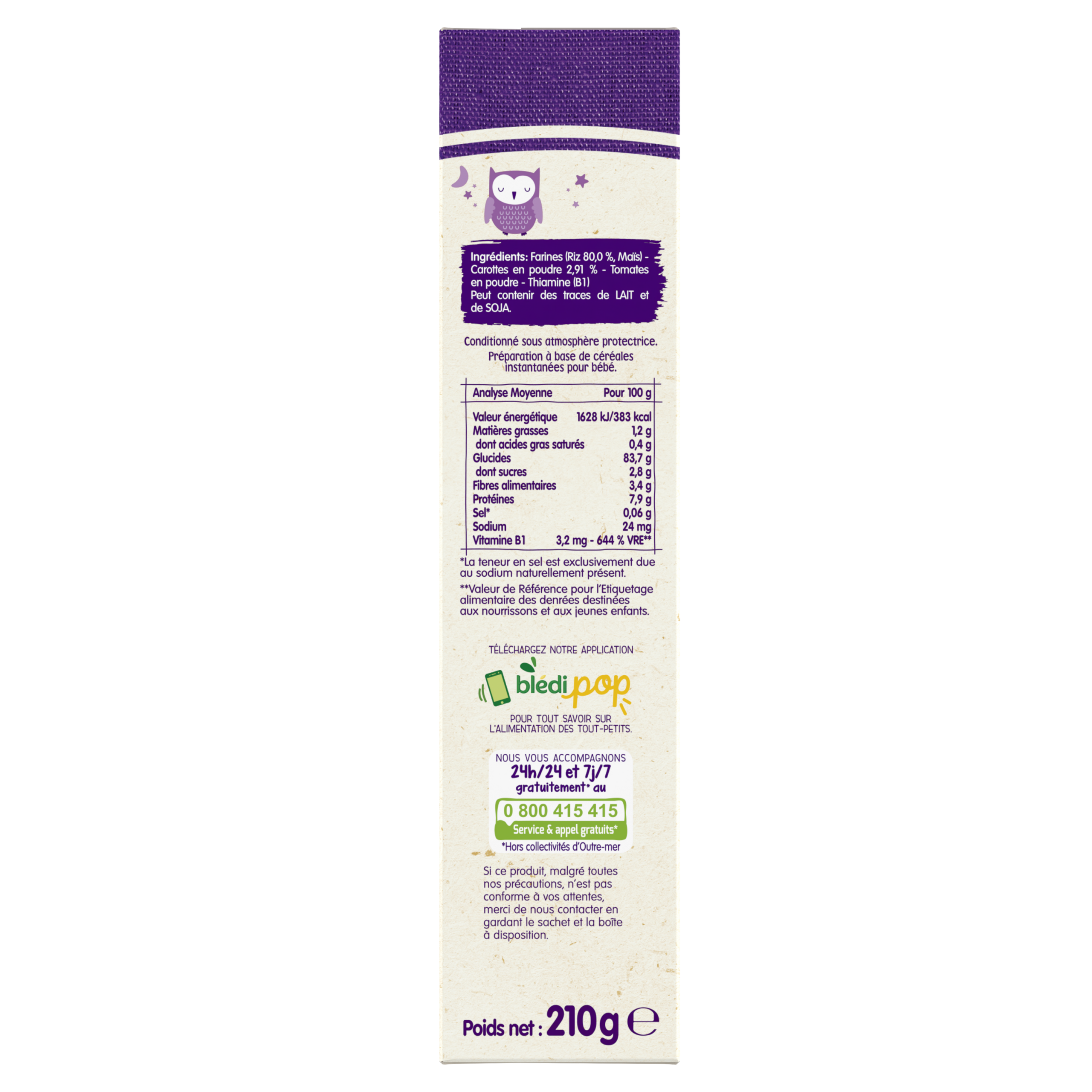 Découvrez Les céréales du soir Blédîner de Blédina : de savoureuses recettes de céréales du soir adaptée pour le dîner de bébé avec une touche de légumes. Initiez bébé à la saveur riz carottes avec notre lot Blédîner Céréales du soir Riz Carottes dès 6 mois, pour faire découvrir à bébé le bon goût des légumes en toute simplicité ! Contient une mesurette pratique pour doser Une texture onctueuse de céréale bébé qui passe à la tétine A reconstituer avec le lait habituel de bébé (lait maternel ou lait de suite) Format pratique et facile à préparer Lot de 3 packs contenant chacun 210g de céréales.