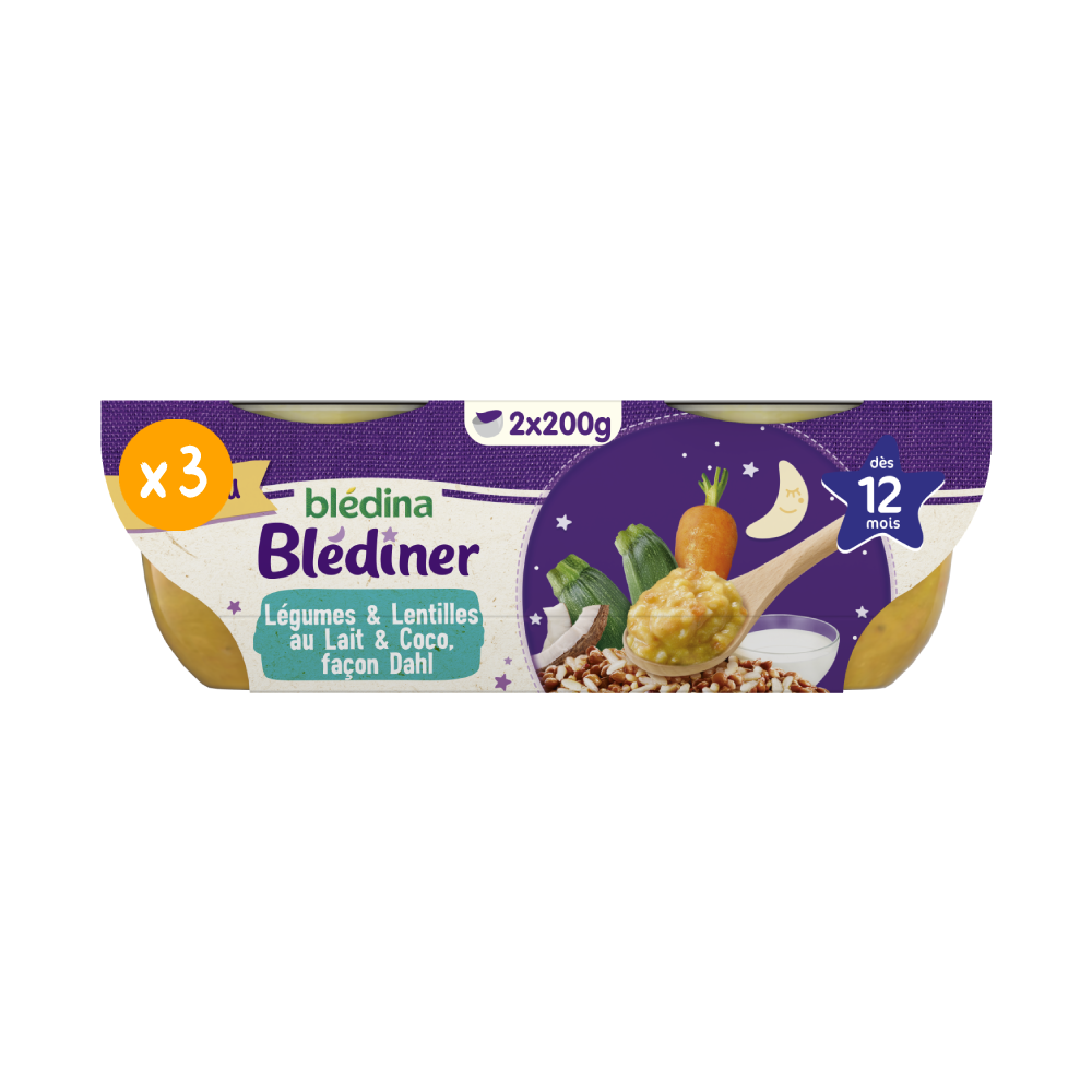 Les bols Blédiner®, de savoureuses recettes BLEDINA spécialement élaborées pour le dîner de bébé. Faites découvrir à bébé de nouvelles saveurs et textures grâce à notre recette aux Légumes et Lentilles au Lait de coco façon Dahl. Désormais nos bols sont sans couvercle ! Et non sans raison, car cela permet à Blédina d’éviter l’utilisation de plus de 130 tonnes de plastique par an*. Cela représente une réduction de 35,6% de plastique sur chacun de nos bols ! Contient 6 bols de 200g pour le repas du soir. *Sur les Bols Blédina (midi et soir) 2x200g sur la base des ventes annuelles 2023.