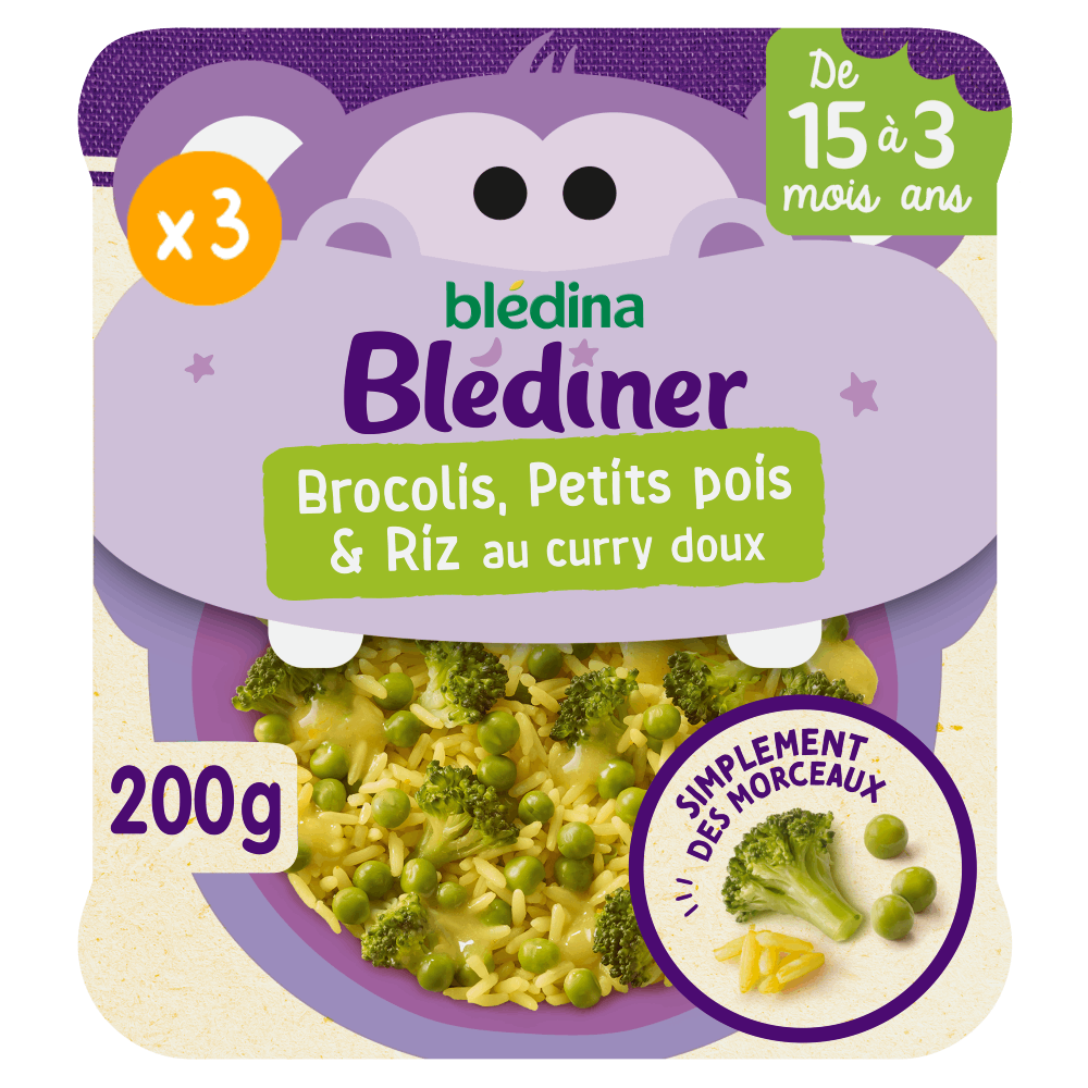 Blédîner Morceaux à dévorer - Brocolis, Petits Pois & Riz au curry doux - Lot x3