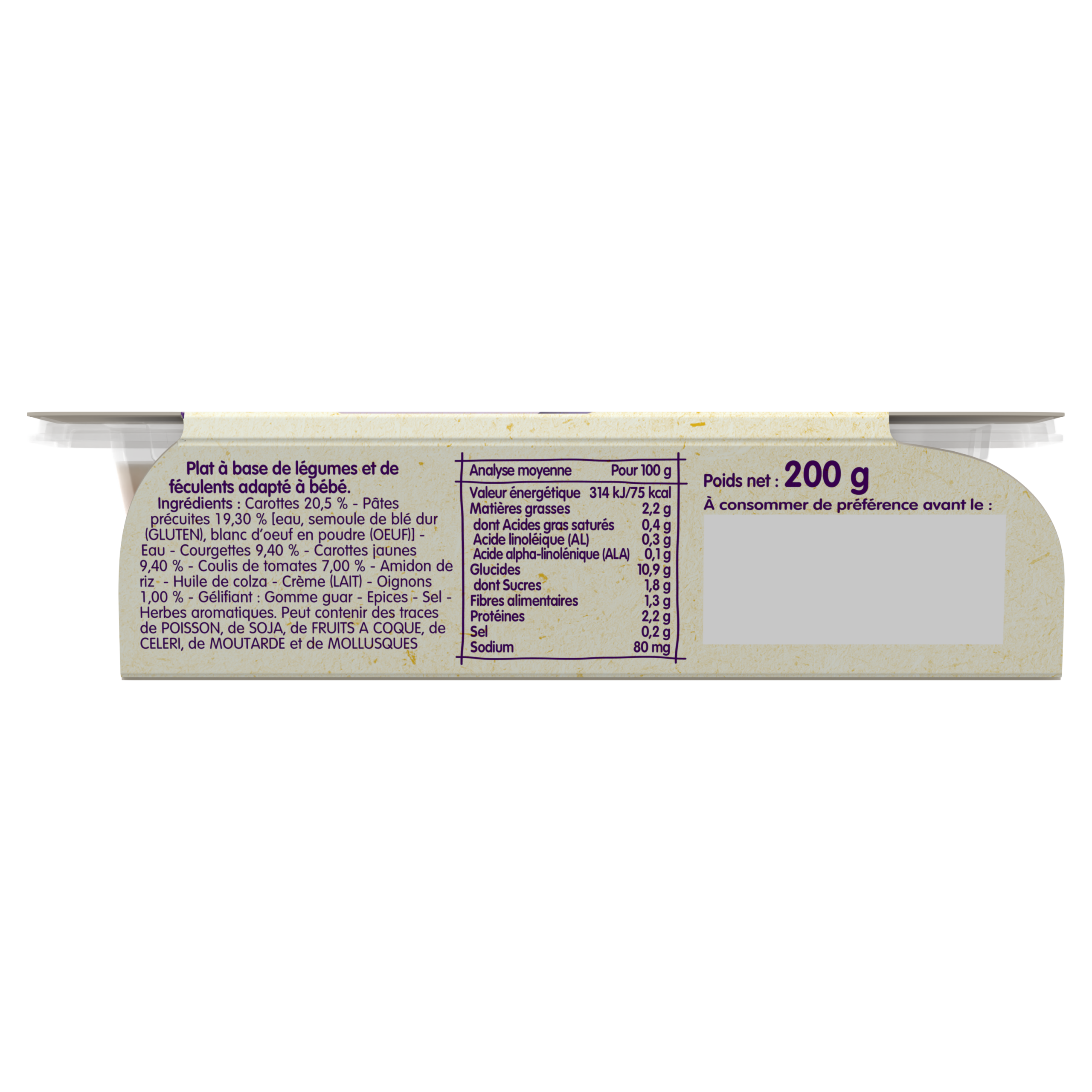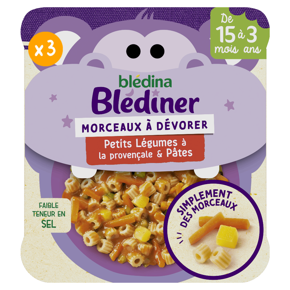 Découvrez les petits plats blédina MORCEAUX À DEVORER de 15 mois à 3 ans (se référer ci-dessous aux détails des informations du produit pour savoir si bébé est prêt).  Petits Légumes à la provençale & Pâtes. Un plat complet pour le soir composé d'ingrédients faciles à reconnaître pour apprendre à votre bébé à manger progressivement comme un grand. Aidez le à reconnaitre tous les bons ingrédients de son assiette ! Ce lot contient 3 assiettes de 200g chacun