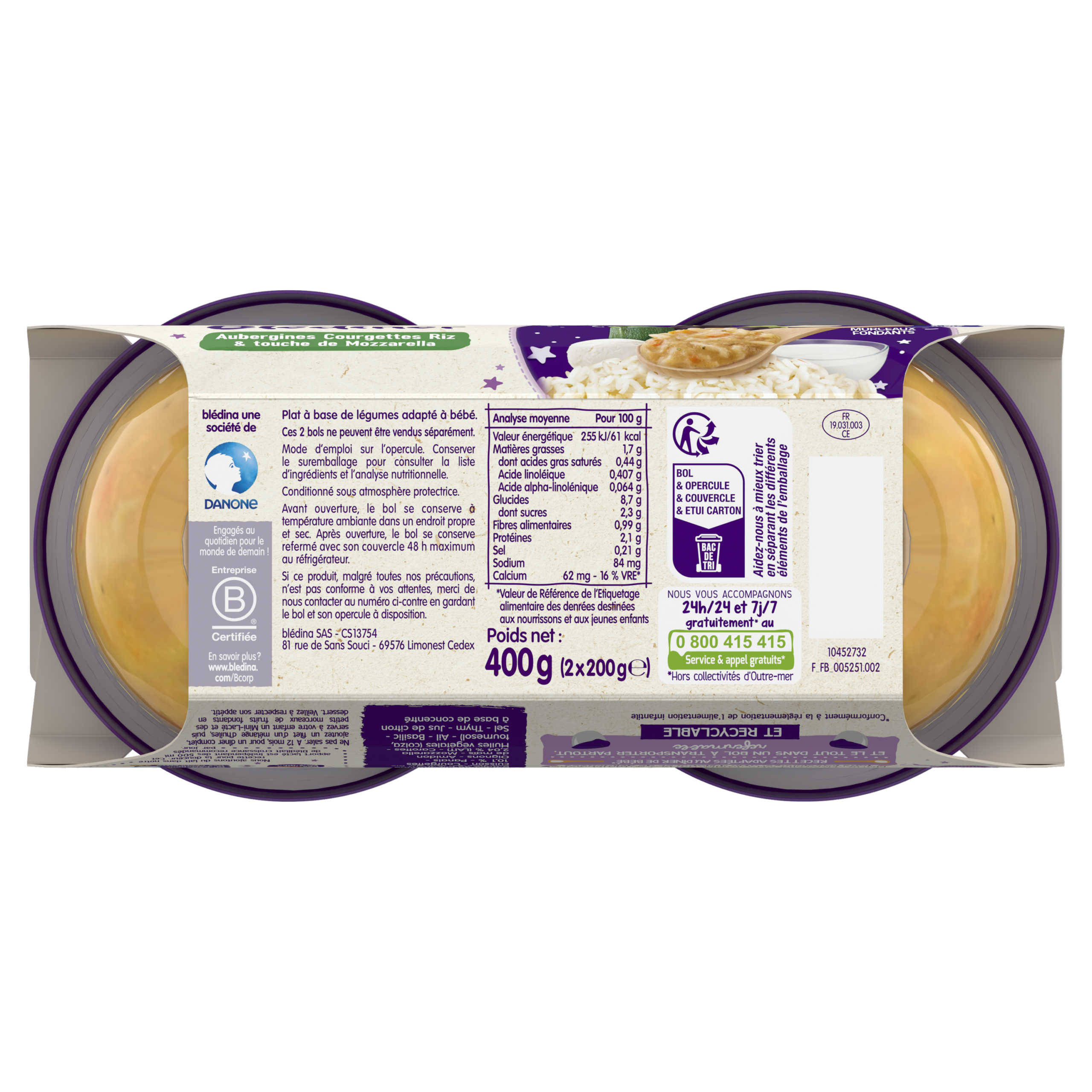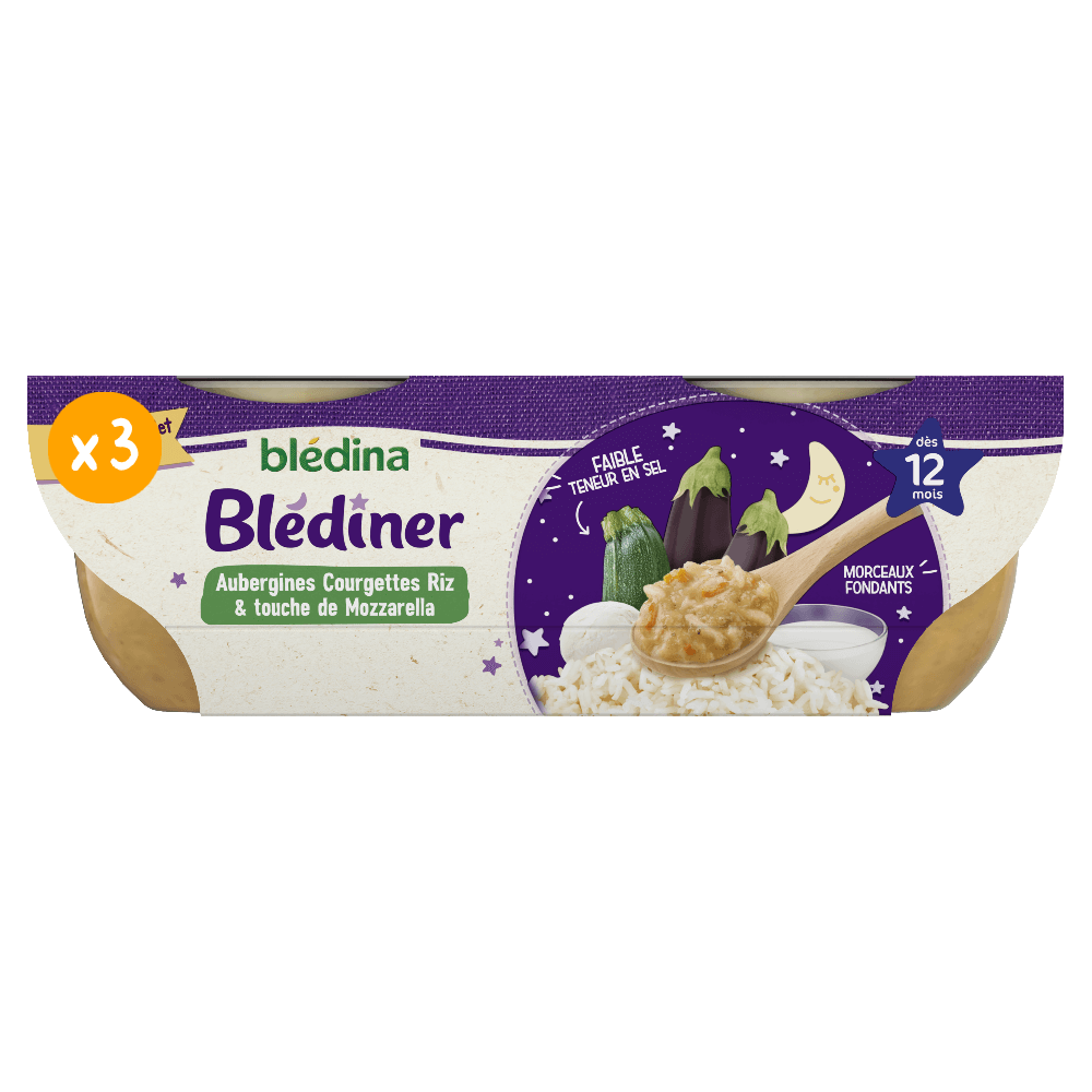 Optez pour notre recette du soir, Blédîner aux Aubergines, Courgettes Riz et touche de Mozzarella pour la gourmandise !    Désormais nos bols sont sans couvercle ! Et non sans raison, car cela permet à Blédina d’éviter l’utilisation de plus de 130 tonnes de plastique par an*. Cela représente une réduction de 35,6% de plastique sur chacun de nos bols !   Lot de 6 bols de 200g chacun    *Sur la base des projections de vente des Bols Blédina 2x200g en 2024 (marché GMS français).