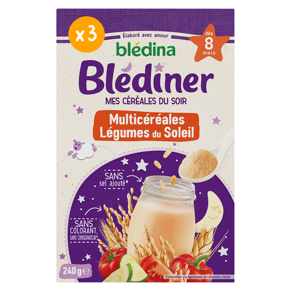Découvrez Les céréales du soir Blédîner de Blédina : de savoureuses recettes de céréales du soir adaptées pour le dîner de bébé avec une touche de légumes. Initiez bébé à de nouvelles saveurs avec notre lot Blédîner Multicéréales Légumes du soleil dès 8 mois, pour faire découvrir à bébé le bon goût des légumes en toute simplicité ! Contient une mesurette pratique pour doser Une texture onctueuse de céréale bébé qui passe à la tétine A reconstituer avec le lait habituel de bébé (lait maternel ou lait de suite) Format pratique et facile à préparer Lot de 3 packs contenant chacun 240g de céréales.