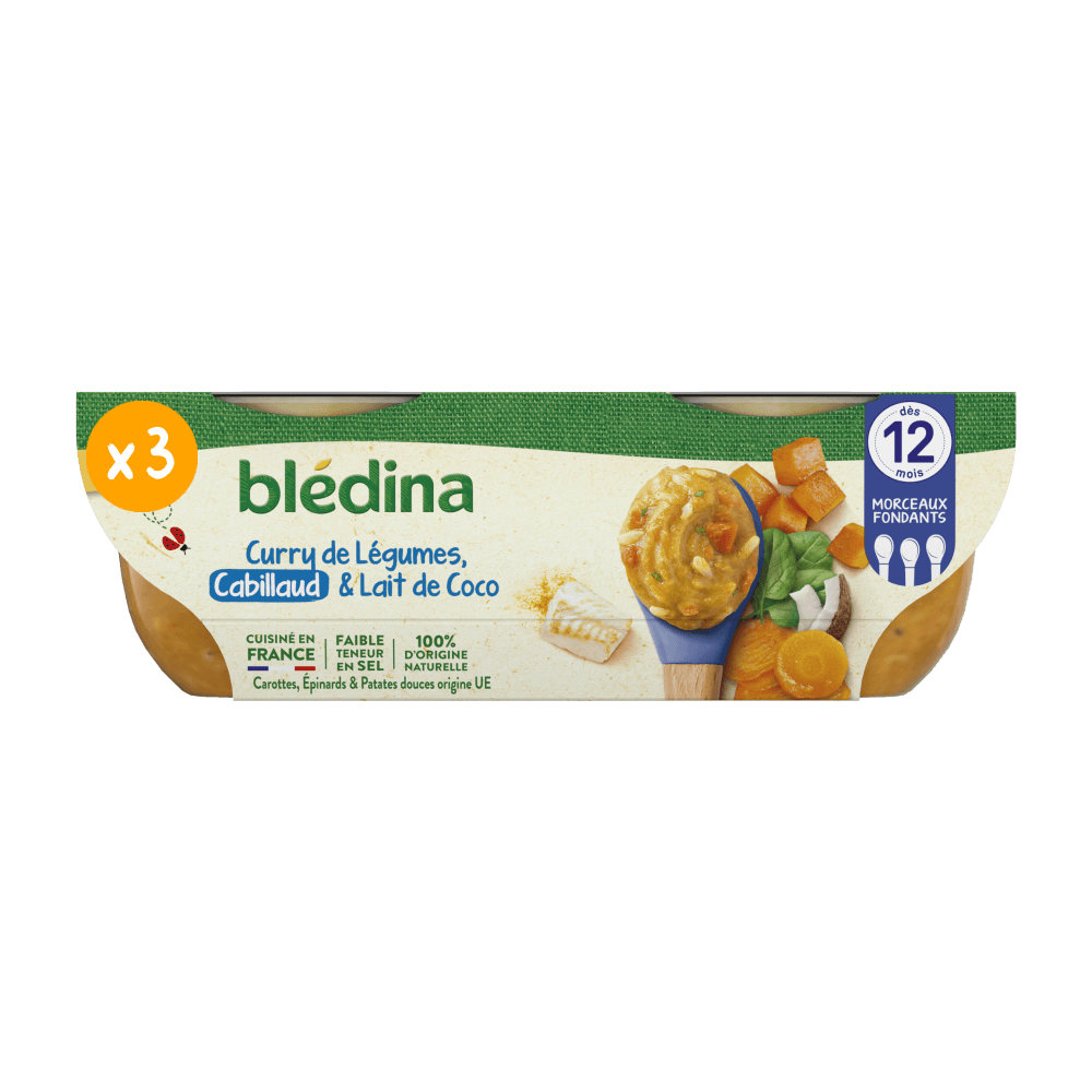 Découvrez notre recette Blédina, Curry de Légumes, Cabillaud et Lait de coco, avec des morceaux fondants pour accompagner bébé dans l'apprentissage de la mastication, dès 12 mois ! Cette recette est subtilement parfumée d’épices pour éveiller les papilles de bébé. Nous avons retravaillé notre gamme Mes Moulinés : désormais les bols Déjeuner offrent une texture progressive de 6 à 12 mois, et sont sans couvercle ! Et non sans raison, car cela permet à Blédina d’éviter l’utilisation de plus de 130 tonnes de plastique par an*. Cela représente une réduction de 35,6% de plastique sur chacun de nos bols ! Lot de 6 bols de 200g chacun *Sur la base des projections de vente des Bols Blédina 2x200g en 2024 (marché GMS français).