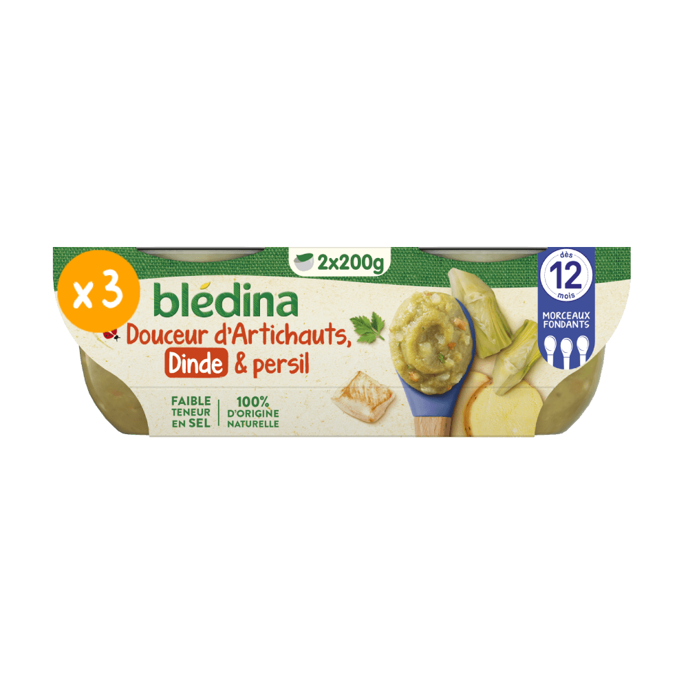 Avec leurs morceaux fondants, ces Bols Déjeuner Douceur d'Artichauts Dinde et persil dès 12 mois vous permettent d'accompagner bébé dans sa découverte des textures et dans l'apprentissage de la mastication !   Nous avons retravaillé notre gamme Mes Moulinés : désormais les bols pour le déjeuner offrent une texture progressive de 6 à 12 mois, et sont sans couvercle ! Et non sans raison, car cela permet à Blédina d’éviter l’utilisation de plus de 130 tonnes de plastique par an*. Cela représente une réduction de 35,6% de plastique sur chacun de nos bols !   Lot de 6 bols de 200g chacun    *Sur la base des projections de vente des Bols Blédina 2x200g en 2024 (marché GMS français).
