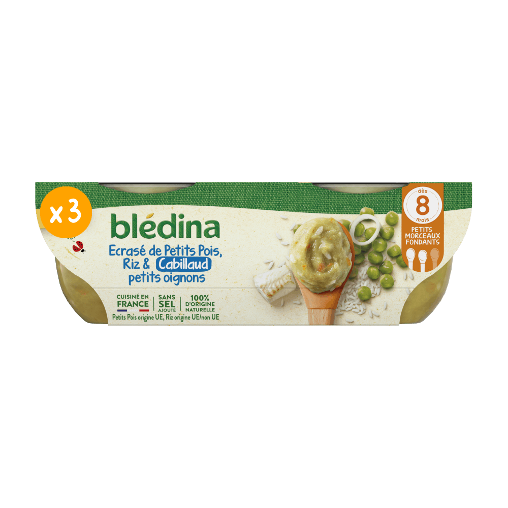 Faites découvrir à bébé notre recette Ecrasé de petits pois Riz Cabillaud et Petits Oignons dès 8 mois. Des petits morceaux fondants pour préparer bébé à bien mâcher. Nous avons retravaillé notre gamme Mes Moulinés : désormais les bols Déjeuner offrent une texture progressive de 6 à 12 mois, et sont sans couvercle ! Et non sans raison, car cela permet à Blédina d’éviter l’utilisation de plus de 130 tonnes de plastique par an*. Cela représente une réduction de 35,6% de plastique sur chacun de nos bols ! Lot de 6 bols de 200g chacun *Sur les bols Blédina (midi et soir), 2 x 200g, sur la base des ventes annuelles de 2023