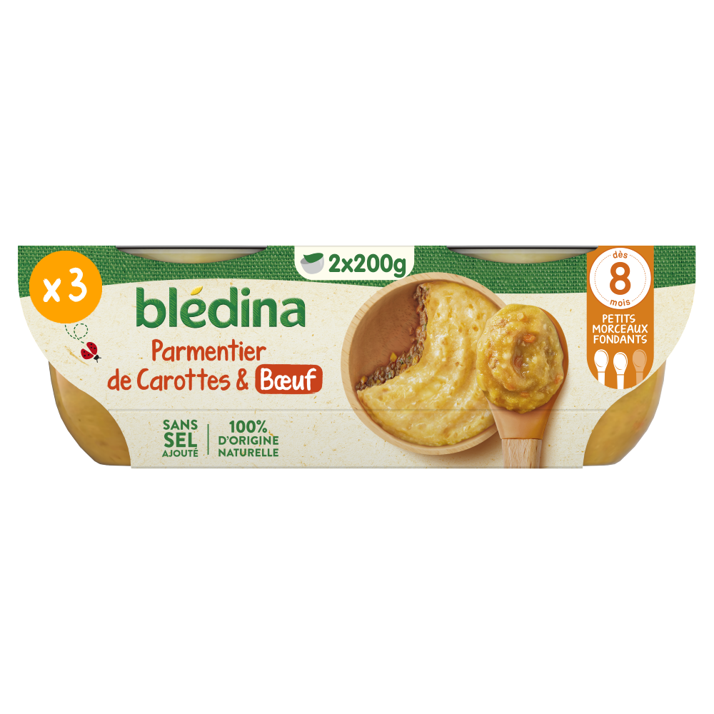 Découvrez nos Bols Déjeuner Parmentier de Carottes et de Bœuf, notre recette adaptée dès les 8 mois de bébé pour le préparer à bien mâcher avec des petits morceaux fondants.    Recette cuisinée en France* et sans sel ajouté.    Nous avons retravaillé notre gamme Mes Moulinés : désormais les bols Déjeuner offrent une texture progressive de 6 à 12 mois, et sont sans couvercle ! Et non sans raison, car cela permet à Blédina d’éviter l’utilisation de plus de 130 tonnes de plastique par an**. Cela représente une réduction de 35,6% de plastique sur chacun de nos bols !   Lot de 6 bols de 200g chacun    * Viande de bœuf origine France, Carottes et Pommes de terre origine UE  **Sur la base des projections de vente des Bols Blédina 2x200g en 2024 (marché GMS français).