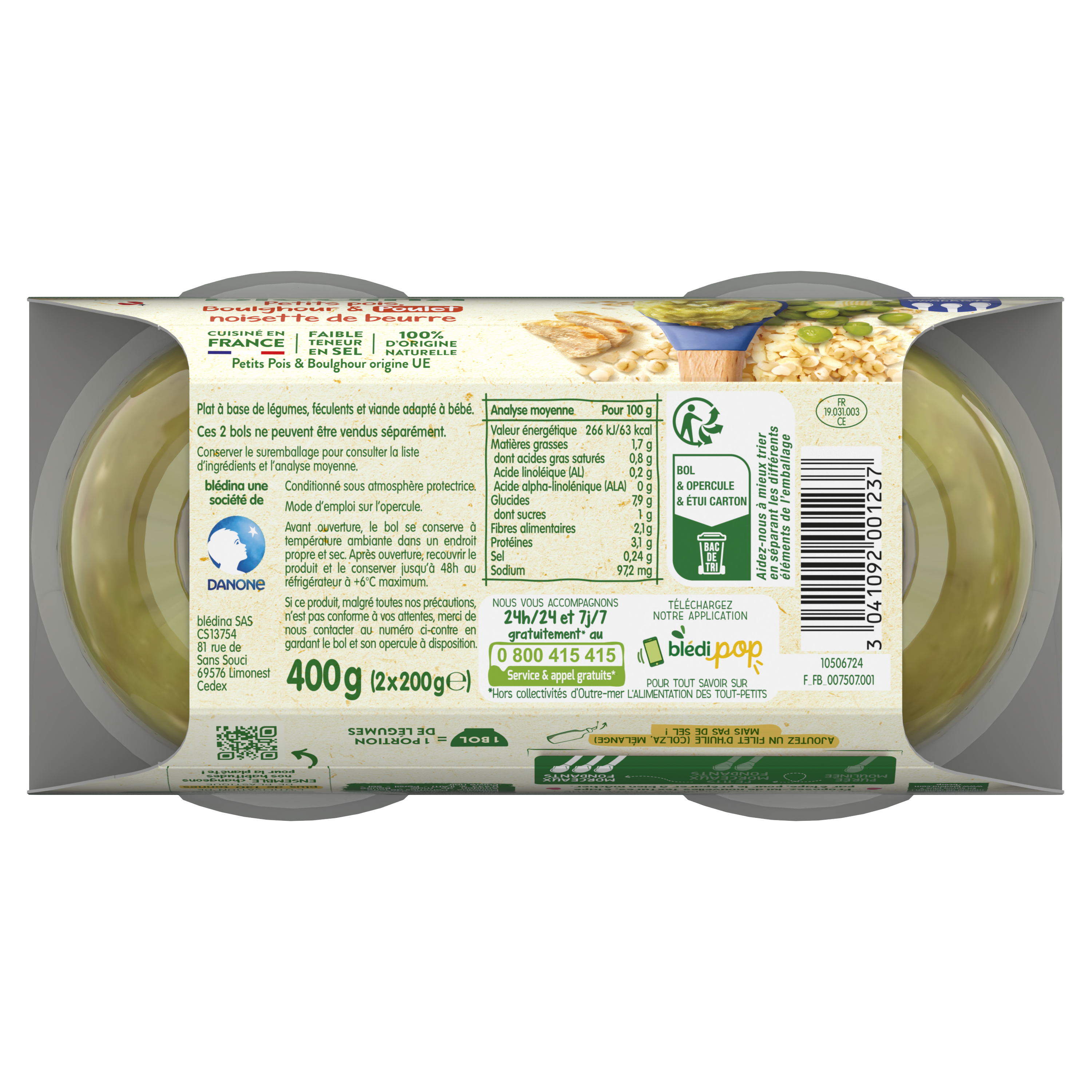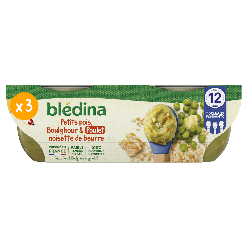Découvrez notre nouvelle recette Petits pois, Boulghour, poulet et sa noisette de beurre, avec des morceaux fondants pour faire découvrir de nouvelles textures à bébé dès 12 mois et lui apprendre à bien mâcher ! Nous avons retravaillé notre gamme Mes Moulinés : désormais les bols pour le déjeuner offrent une texture progressive de 6 à 12 mois, et sont sans couvercle ! Et non sans raison, car cela permet à Blédina d’éviter l’utilisation de plus de 130 tonnes de plastique par an*. Cela représente une réduction de 35,6% de plastique sur chacun de nos bols ! Lot de 6 bols de 200g chacun *Sur la base des projections de vente des Bols Blédina 2x200g en 2024 (marché GMS français).