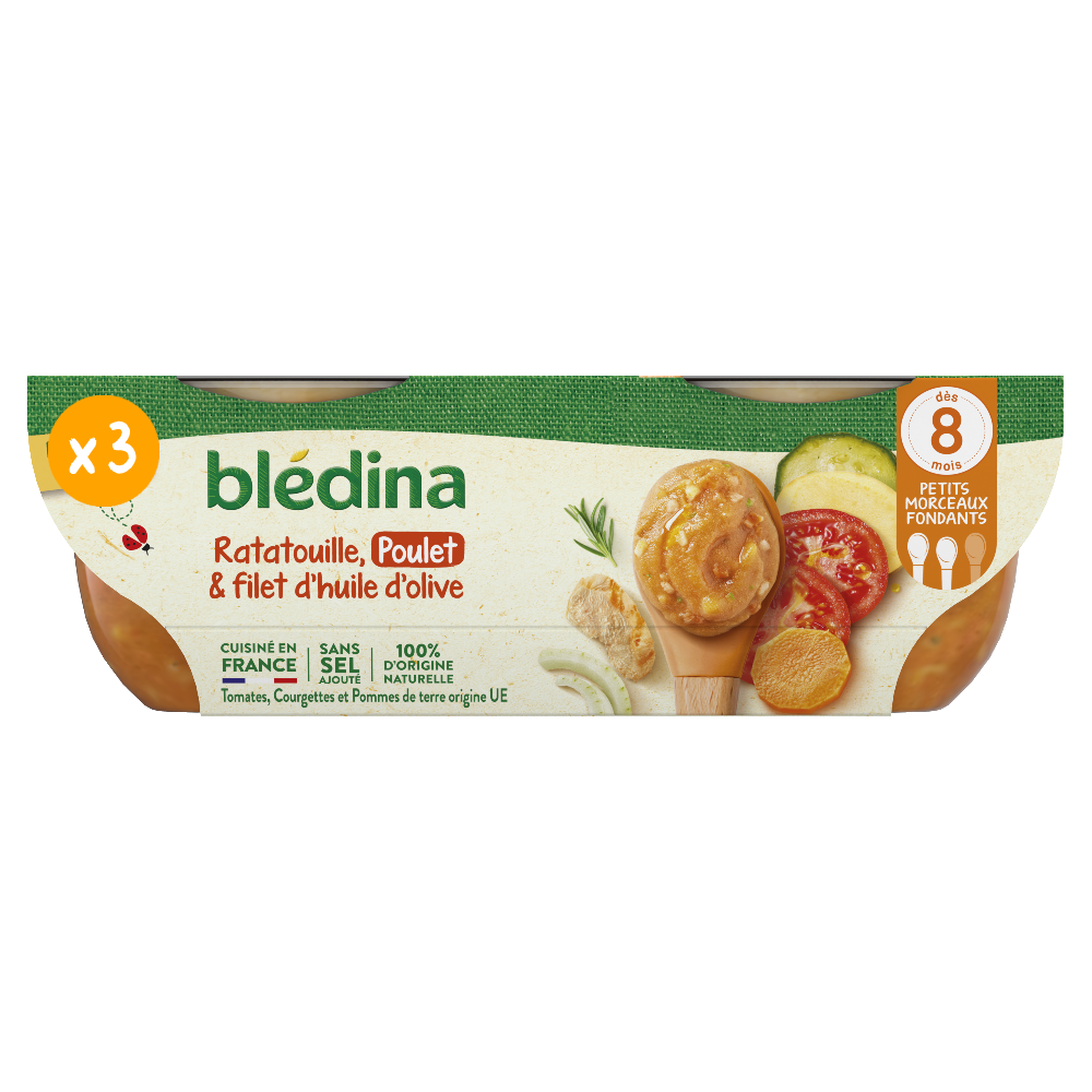 Retrouvez notre nouvelle recette Ratatouille Poulet et filet d'huile d'olive dès 8 mois, un petit plat inspiré du fait maison. Avec ses petits morceaux fondants, cette recette vous permet d'accompagner sereinement bébé dans l'apprentissage de la mastication ! Nous avons retravaillé notre gamme Mes Moulinés : désormais les bols Déjeuner offrent une texture progressive de 6 à 12 mois, et sont sans couvercle ! Et non sans raison, car cela permet à Blédina d’éviter l’utilisation de plus de 130 tonnes de plastique par an**. Cela représente une réduction de 35,6% de plastique sur chacun de nos bols ! Recette cuisinée* en France et sans sel ajouté. Lot de 6 bols de 200g chacun * Poulet origine France, Tomates, Courgettes et Pommes de terre origine UE **Sur la base des projections de vente des Bols Blédina 2x200g en 2024 (marché GMS français).