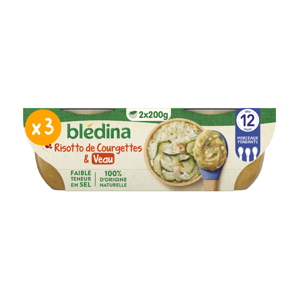 Découvrez nos bols Déjeuner Risotto de Courgettes et Veau, un plat adapté à bébé dès 12 mois, inspiré du fait-maison, cuisiné en France* et avec des morceaux fondants pour continuer l'apprentissage de la mastication. Nous avons retravaillé notre gamme Mes Moulinés : désormais les bols pour le déjeuner offrent une texture progressive de 6 à 12 mois, et sont sans couvercle ! Et non sans raison, car cela permet à Blédina d’éviter l’utilisation de plus de 130 tonnes de plastique par an**. Cela représente une réduction de 35,6% de plastique sur chacun de nos bols ! Lot de 6 bols de 200g chacun * Courgettes origine UE / Rie origine UE/ non UE et Veau issue du Label Rouge Origine France **Sur la base des projections de vente des Bols Blédina 2x200g en 2024 (marché GMS français).