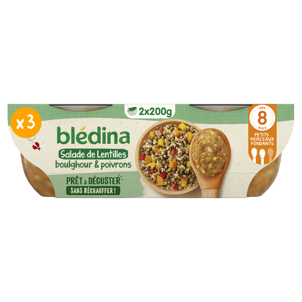 Découvrez notre notre Salade de Lentilles Boulghour et Poivrons revisitées et adaptées à bébé*, une recette directement prête à déguster sans besoin de la réchauffer ! Avec des petits morceaux fondants pour préparer bébé à bien mâcher ! Désormais les bols Blédina sont sans couvercle ! Et non sans raison, car cela permet à Blédina d’éviter l’utilisation de plus de 130 tonnes de plastique par an**. Cela représente une réduction de 35,6% de plastique sur chacun de nos bols ! Ce lot contient 6 bols de 200g chacun *conformément à la réglementation de l'alimentation infantile **Sur les Bols Blédina (midi et soir) 2x200g sur la base des ventes annuelles 2023.