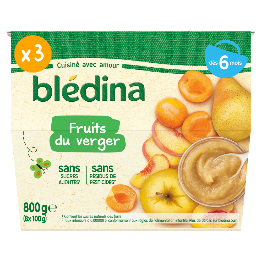 Découvrez Les coupelles de fruits Blédina : de savoureuses recettes de purées de fruits pour le goûter, déjeuner ou dîner de bébé dès 6 mois. Faites découvrir à bébé une incroyable variété de fruits avec l’ensemble de nos saveurs de la gamme Coupelles de fruits !   Sans sucres ajoutés : contient les sucres naturels des fruits. Sans résidus de pesticides : taux inférieurs à 0,000001%, conformément aux règles de l'alimentation infantile. Plus de détails sur bledina.com. Plus de 15 recettes de purées de fruits à découvrir, élaborées par nos nutritionnistes et cuisinées en France à Brive la Gaillarde et parfaitement adaptées à l'âge de bébé (conformément à la réglementation de l'alimentation infantile).   Lot de 3 packs contenant chacun 8 coupelles de 100g.