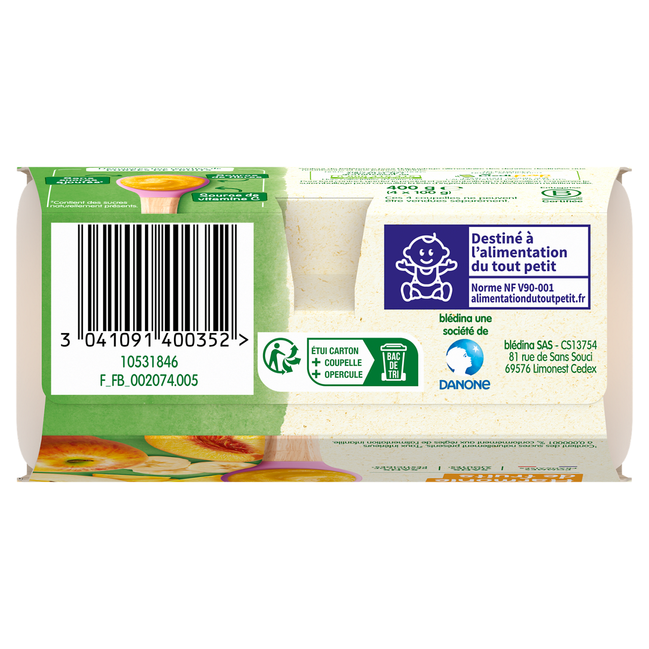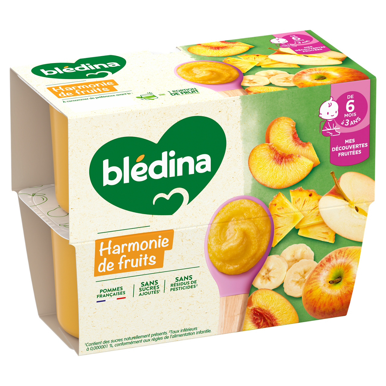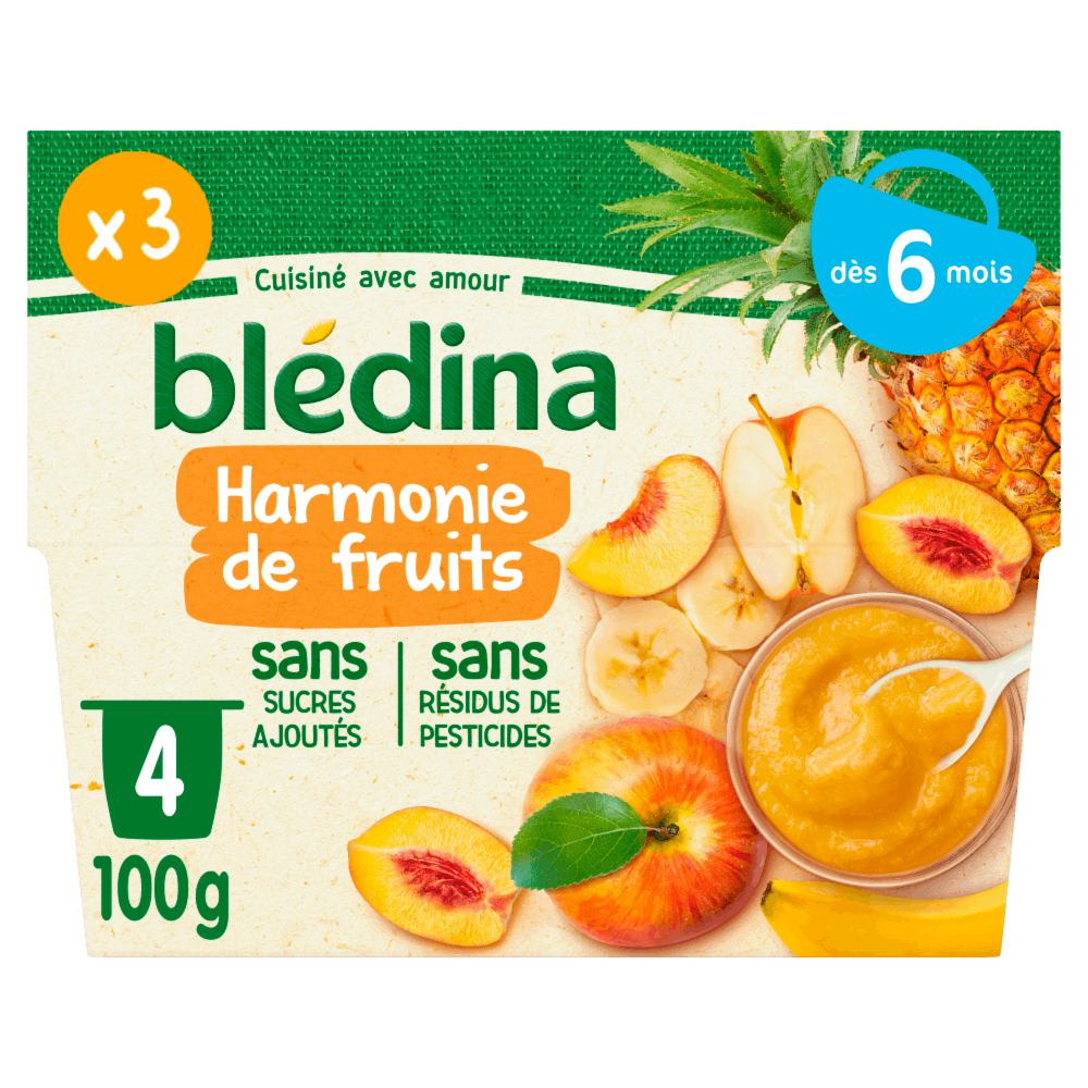 Découvrez Les coupelles de fruits Blédina : de savoureuses recettes de purées de fruits pour le goûter, déjeuner ou dîner de bébé dès 6 mois. Faites découvrir à bébé une incroyable variété de fruits avec l’ensemble de nos saveurs de la gamme Coupelles de fruits !   Purée de fruits sans sucres ajoutées, contenant uniquement les sucres naturels des fruits ! Cuisinés en France, à Brive la Gaillarde Une texture onctueuse et pulpeuse Plus de 15 variétés à découvrir !   Lot de 3 packs contenant chacun 4 coupelles de 100g.