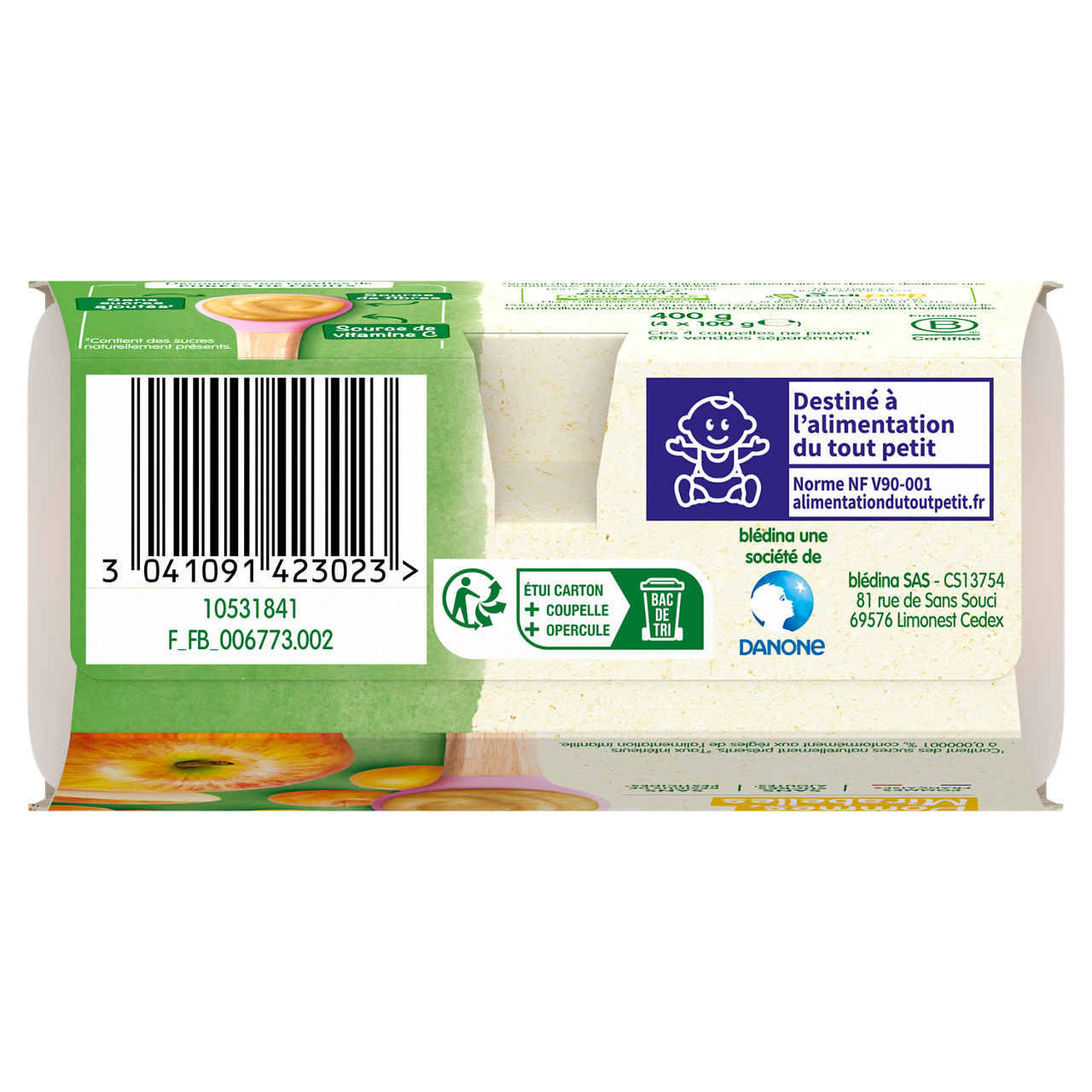 Découvrez Les coupelles de fruits Blédina : de savoureuses recettes de purées de fruits pour le goûter, déjeuner ou dîner de bébé dès 4/6 mois. Faites découvrir à bébé une incroyable variété de fruits avec l’ensemble de nos saveurs de la gamme Coupelles de fruits !   Purée de fruits sans sucres ajoutées, contenant uniquement les sucres naturels des fruits ! Cuisinés en France, à Brive la Gaillarde Une texture onctueuse et pulpeuse Plus de 15 variétés à découvrir !   Lot de 3 packs contenant chacun 4 coupelles de 100g.