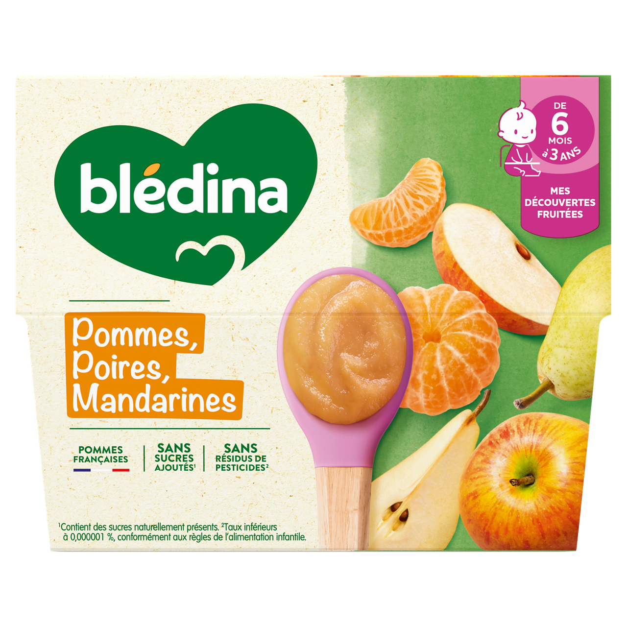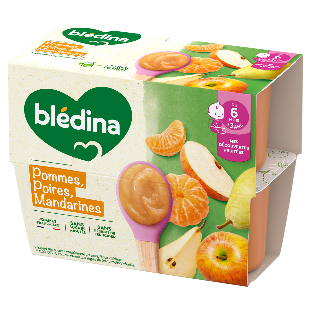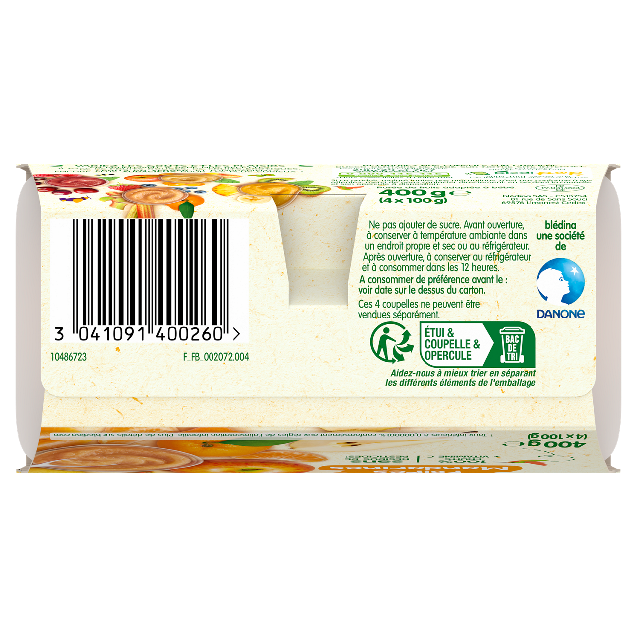 Découvrez Les coupelles de fruits Blédina : de savoureuses recettes de purées de fruits pour le goûter, déjeuner ou dîner de bébé dès 8 mois. Faites découvrir à bébé une incroyable variété de fruits avec l’ensemble de nos saveurs de la gamme Coupelles de fruits !   Purée de fruits sans sucres ajoutées, contenant uniquement les sucres naturels des fruits ! Cuisinés en France, à Brive la Gaillarde Une texture onctueuse et pulpeuse Plus de 15 variétés à découvrir !   Lot de 3 packs contenant chacun 4 coupelles de 100g.