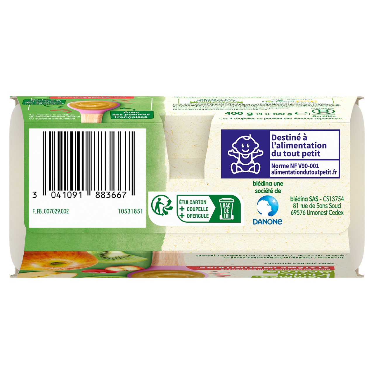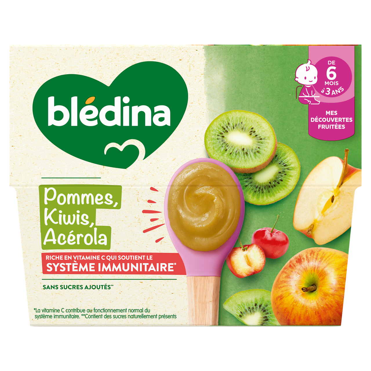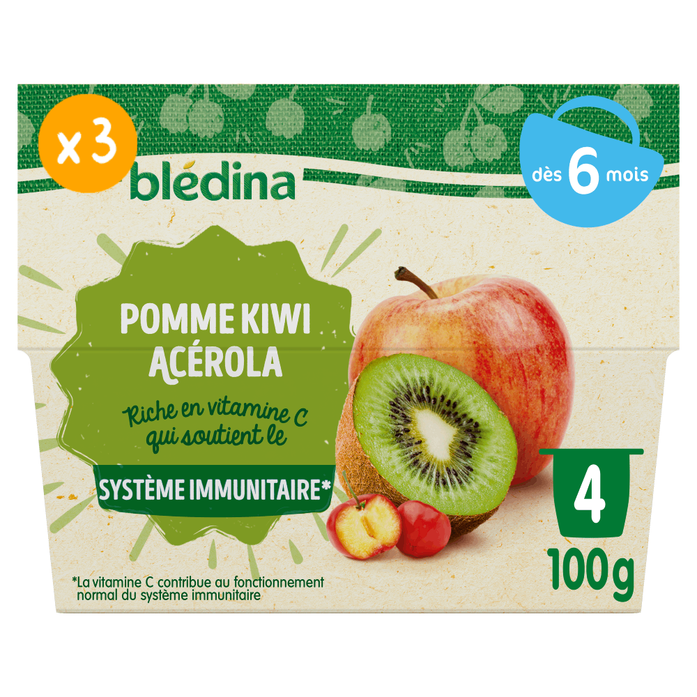 Découvrez les nouvelles recettes des coupelles de fruits Blédina qui sont naturellement riches en vitamine C, qui contribue au fonctionnement normal du système immunitaire. Faites découvrir à bébé une incroyable variété de fruits avec l’ensemble de nos saveurs de la gamme Coupelles de fruits. Riche en vitamine C qui soutient le système immunitaire*. La vitamine C contribue au fonctionnement normal du système immunitaire. Sans sucres ajoutés : contient les sucres naturels des fruits. Sans résidus de pesticides : taux inférieurs à 0,000001%, et conformément aux règles de l'alimentation infantile. Plus de détails sur bledina.com. Plus de 15 recettes de purées de fruits à découvrir, élaborées par nos nutritionnistes et cuisinées en France à Brive la Gaillarde et parfaitement adaptées à l'âge de bébé (conformément à la réglementation de l'alimentation infantile). Lot de 3 packs contenant chacun 4 coupelles de 100g.