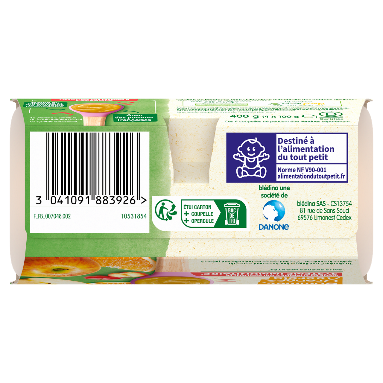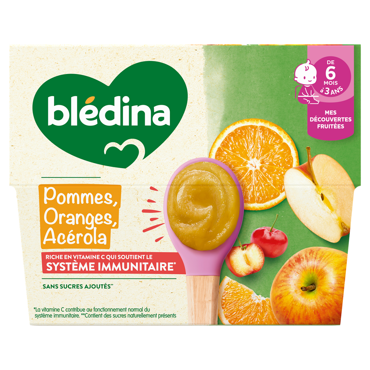De nouvelles recettes de la gamme Coupelles de fruits Blédina pour commencer la diversification alimentaire : naturellement riches en vitamine C, qui contribue au fonctionnement normal du système immunitaire. Des coupelles de fruits pour le goûter, déjeuner ou dîner de bébé. Riche en vitamine C qui soutient le système immunitaire* Sans sucres ajoutés : contient les sucres naturels des fruits Sans résidus de pesticides : taux inférieurs à 0,000001%, conformément aux règles de l'alimentation infantile. Plus de 15 recettes de purées de fruits à découvrir, élaborées par nos nutritionnistes et cuisinées en France à Brive la Gaillarde et parfaitement adaptées à l'âge de bébé (conformément à la réglementation de l'alimentation infantile). Lot de 3 packs contenant chacun 4 coupelles de 100g. *La vitamine C contribue au fonctionnement normal du système immunitaire