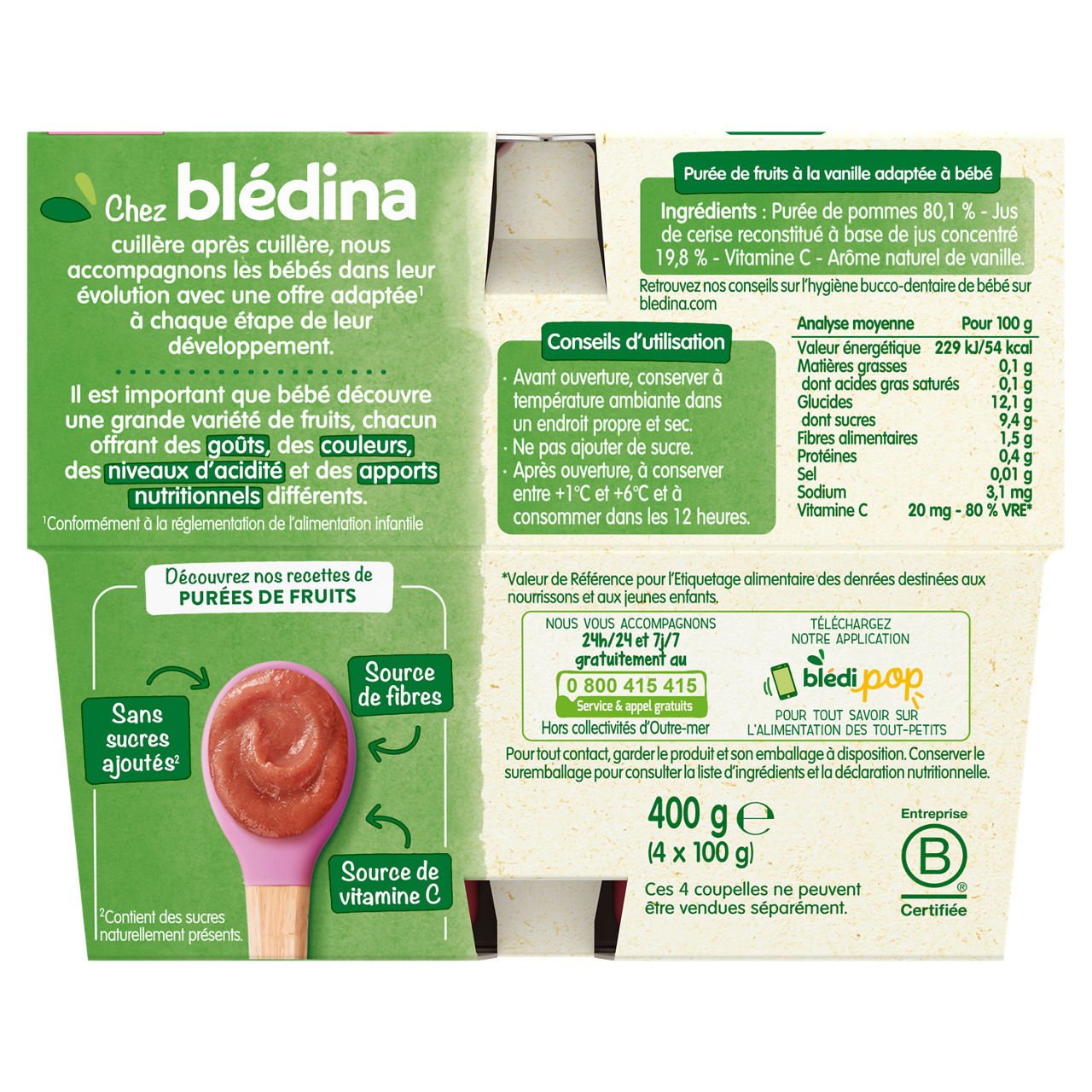 Découvrez Les coupelles de fruits Blédina : de savoureuses recettes de purées de fruits pour le goûter, déjeuner ou dîner de bébé dès 8 mois. Faites découvrir à bébé une incroyable variété de fruits avec l’ensemble de nos saveurs de la gamme Coupelles de fruits !   Purée de fruits sans sucres ajoutées, contenant uniquement les sucres naturels des fruits ! Cuisinés en France, à Brive la Gaillarde Une texture onctueuse et pulpeuse Plus de 15 variétés à découvrir !   Lot de 3 packs contenant chacun 4 coupelles de 100g.