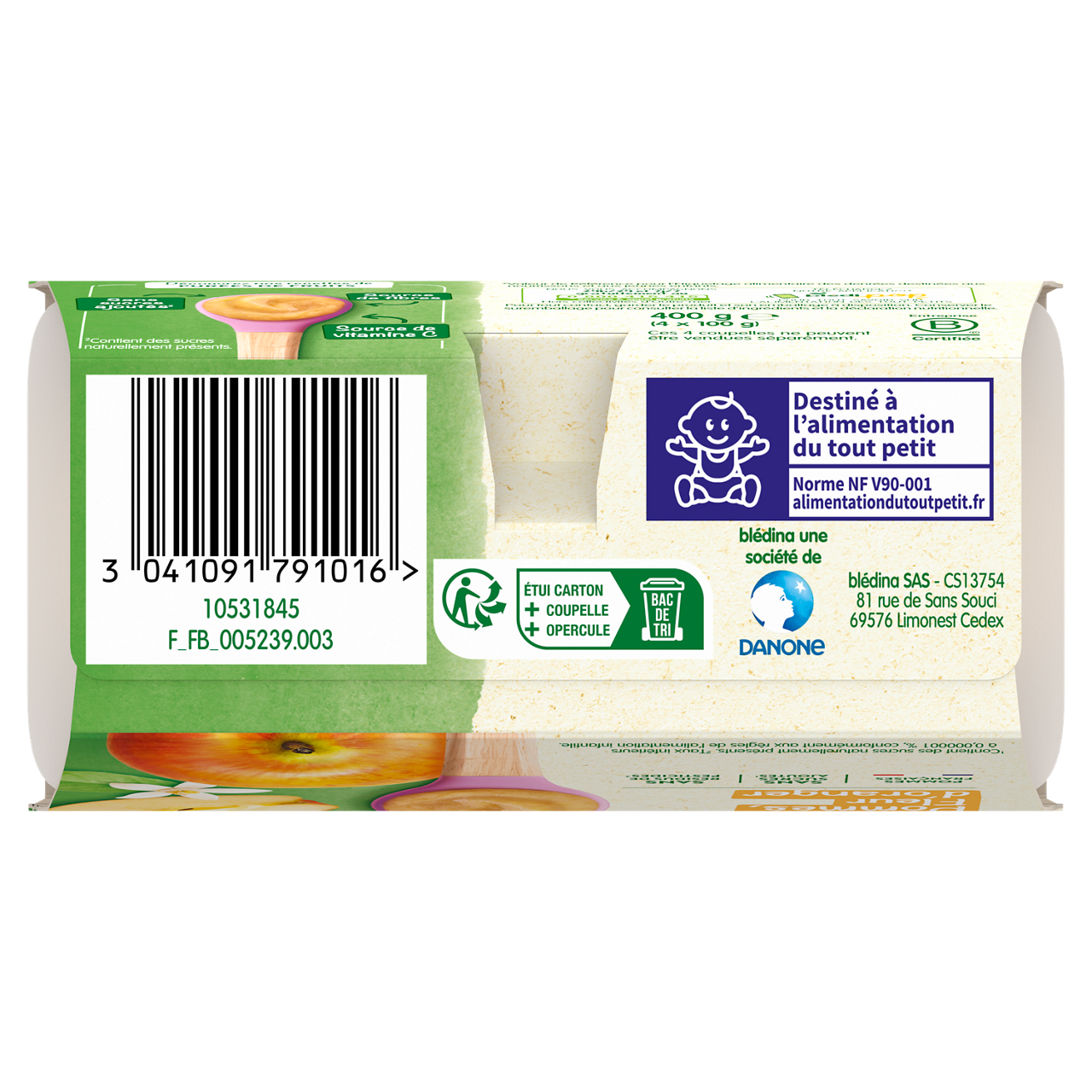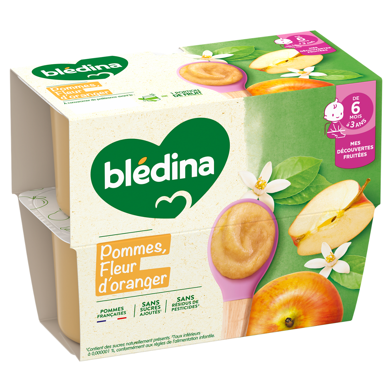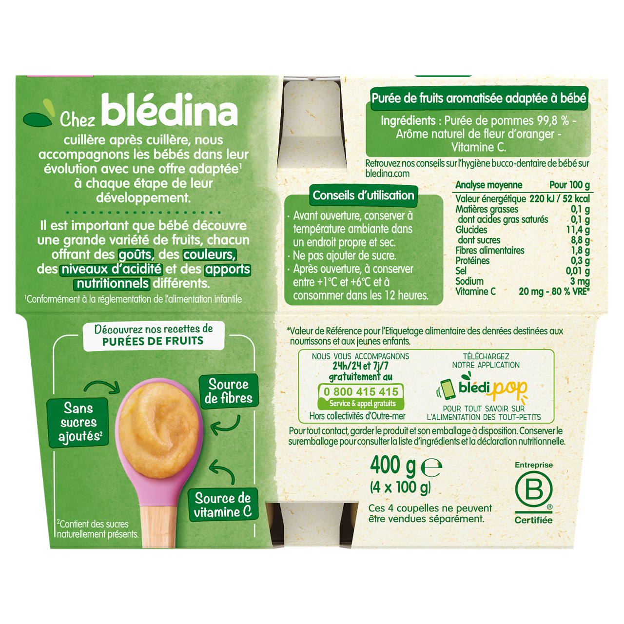 Découvrez Les coupelles Pommes Fleur d'Oranger: de savoureuses recettes de purées de fruits pour le goûter, déjeuner ou dîner de bébé dès 8 mois. Faites découvrir à bébé une incroyable variété de fruits avec l’ensemble de nos saveurs de la gamme Coupelles de fruits !   Purée de fruits sans sucres ajoutées, contenant uniquement les sucres naturels des fruits ! Cuisinés en France, à Brive la Gaillarde Une texture onctueuse et pulpeuse Plus de 15 variétés à découvrir !   Lot de 3 packs contenant chacun 4 coupelles de 100g.
