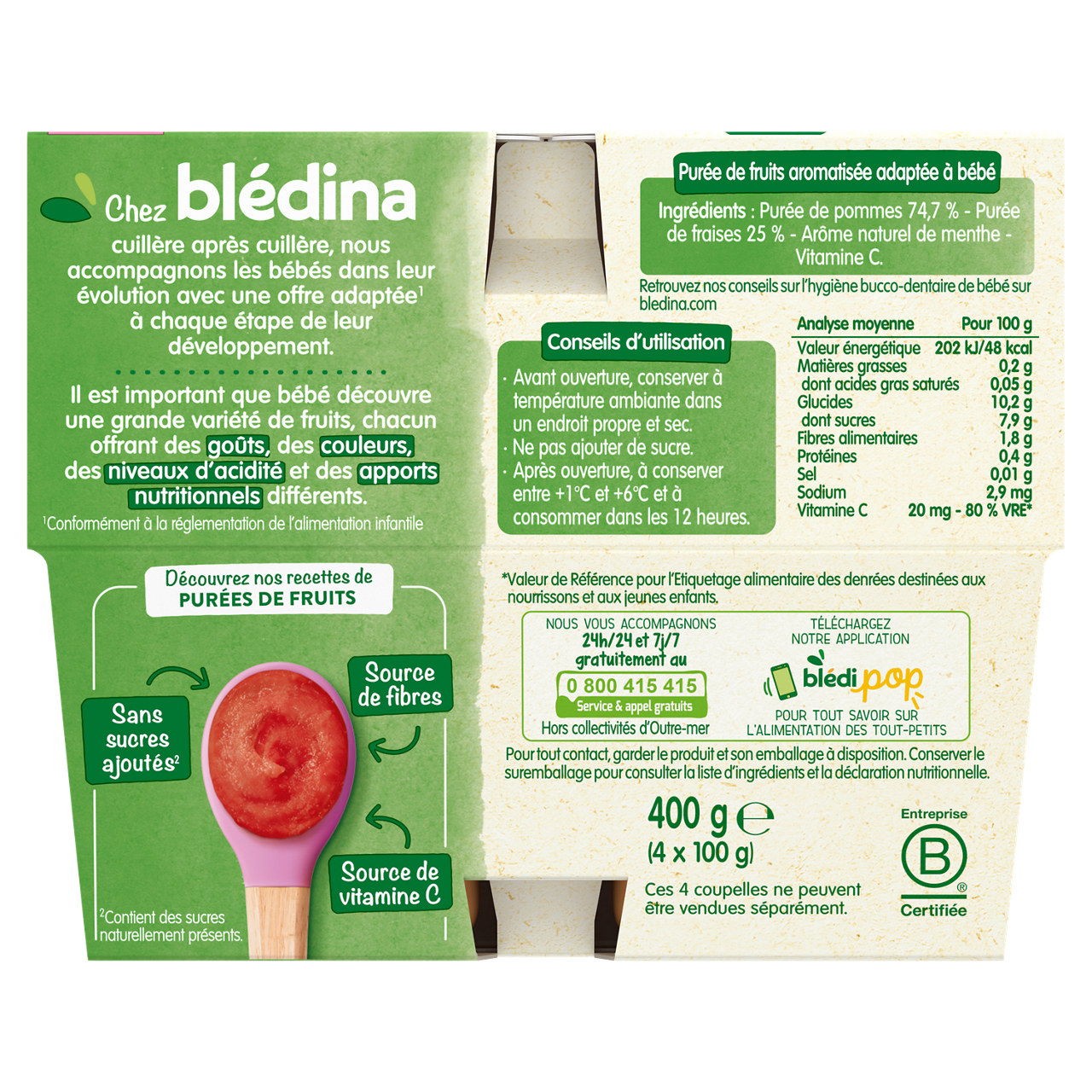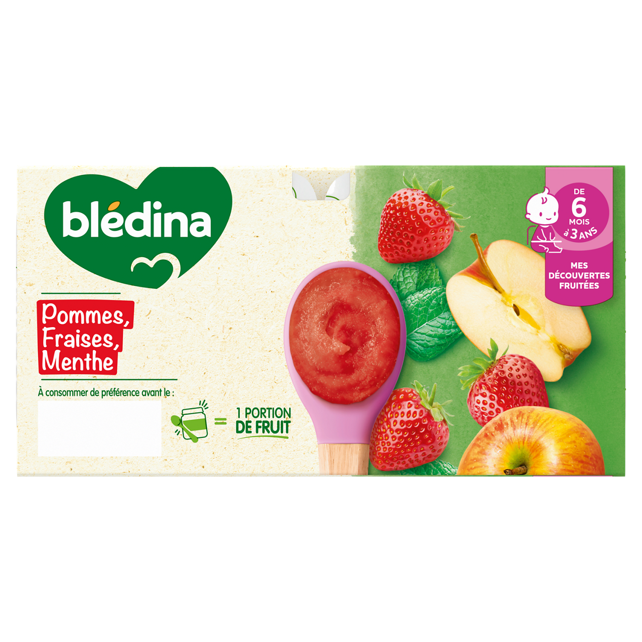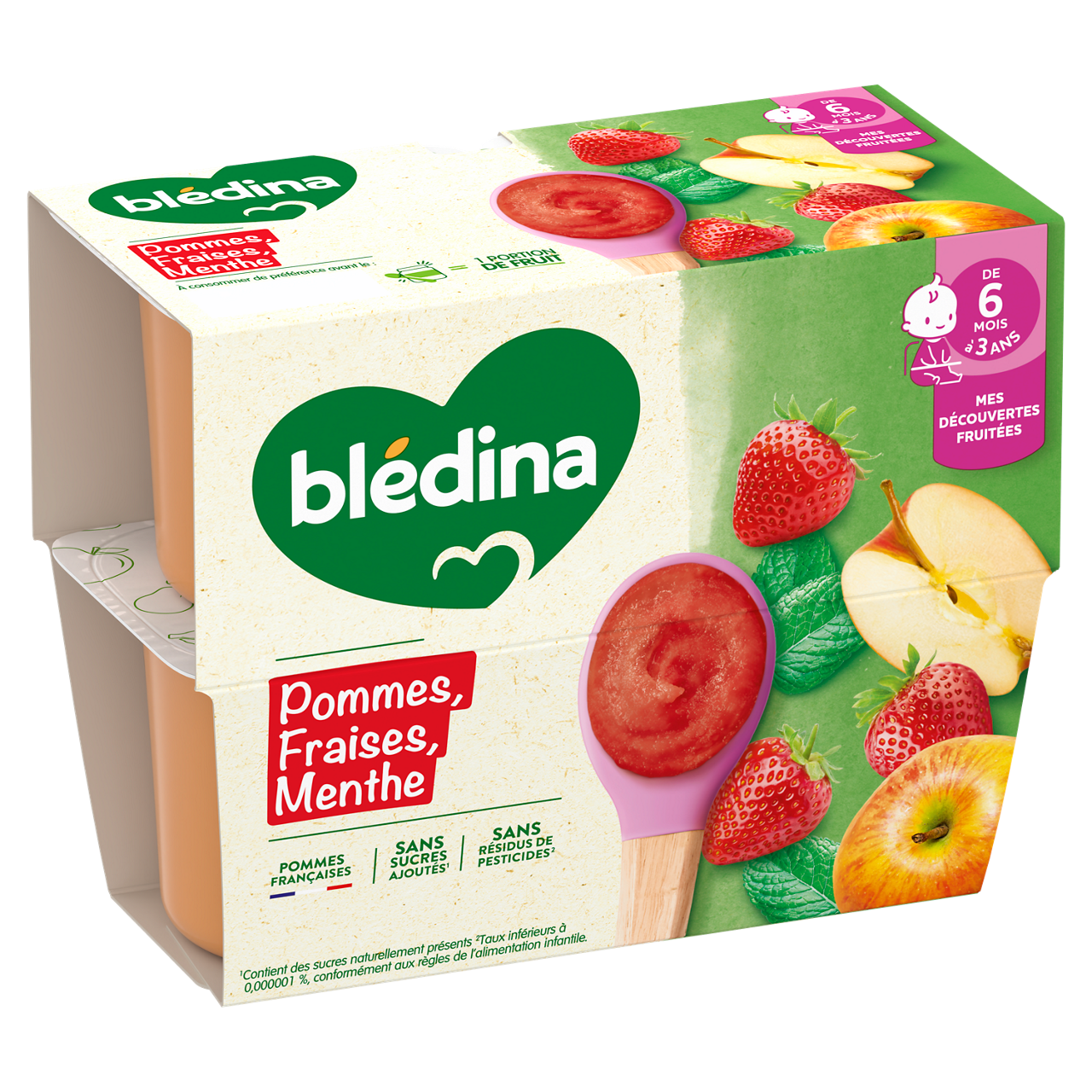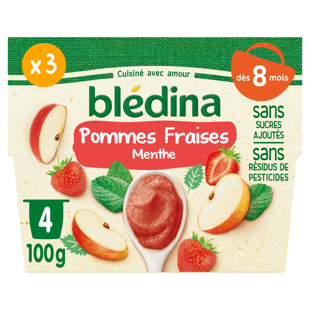 Découvrez Les coupelles Pommes Fraises Menthe: de savoureuses recettes de purées de fruits pour le goûter, déjeuner ou dîner de bébé dès 8 mois. Faites découvrir à bébé une incroyable variété de fruits avec l’ensemble de nos saveurs de la gamme Coupelles de fruits !   Purée de fruits sans sucres ajoutées, contenant uniquement les sucres naturels des fruits ! Cuisinés en France, à Brive la Gaillarde Une texture onctueuse et pulpeuse Plus de 15 variétés à découvrir !   Lot de 3 packs contenant chacun 4 coupelles de 100g.