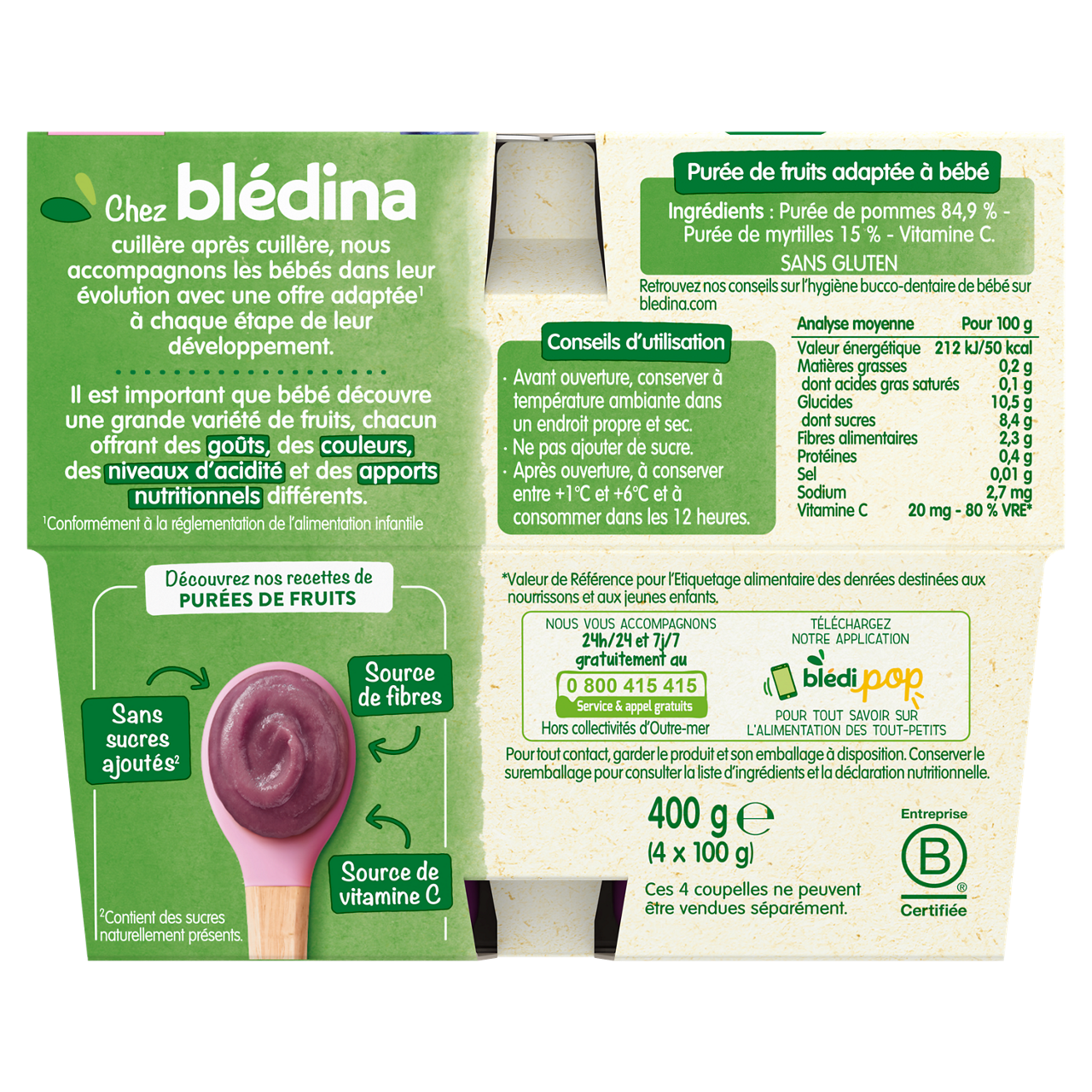 Découvrez Les coupelles de fruits Blédina : de savoureuses recettes de purées de fruits pour le goûter, déjeuner ou dîner de bébé dès 8 mois. Faites découvrir à bébé une incroyable variété de fruits avec l’ensemble de nos saveurs de la gamme Coupelles de fruits !   Purée de fruits sans sucres ajoutées, contenant uniquement les sucres naturels des fruits ! Cuisinés en France, à Brive la Gaillarde Une texture onctueuse et pulpeuse Plus de 15 variétés à découvrir !   Lot de 3 packs contenant chacun 4 coupelles de 100g.