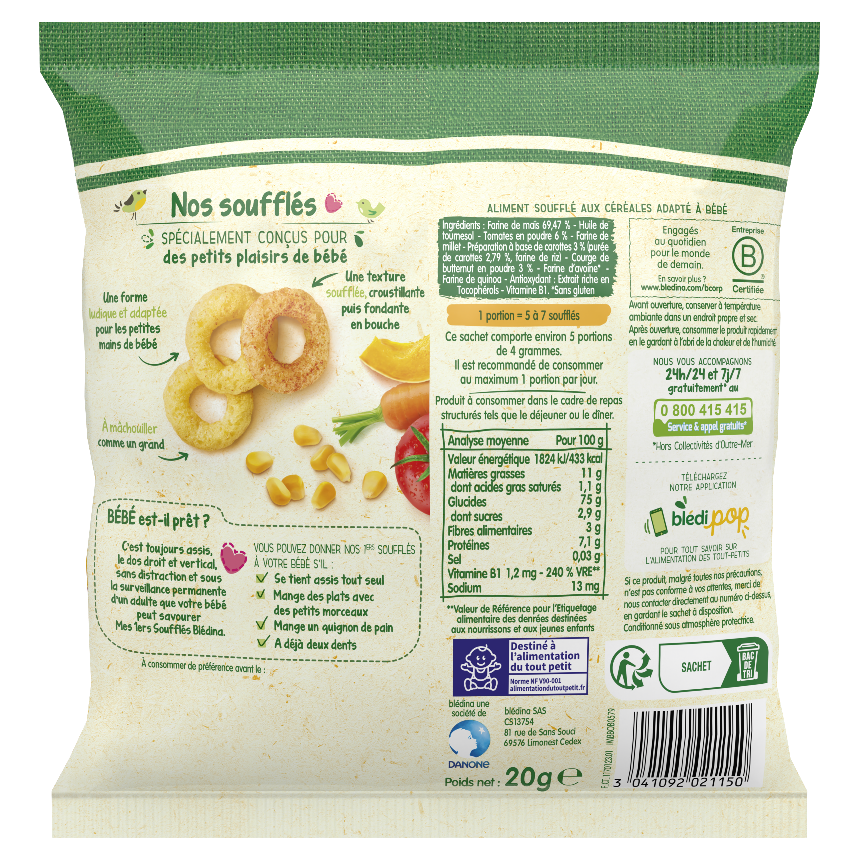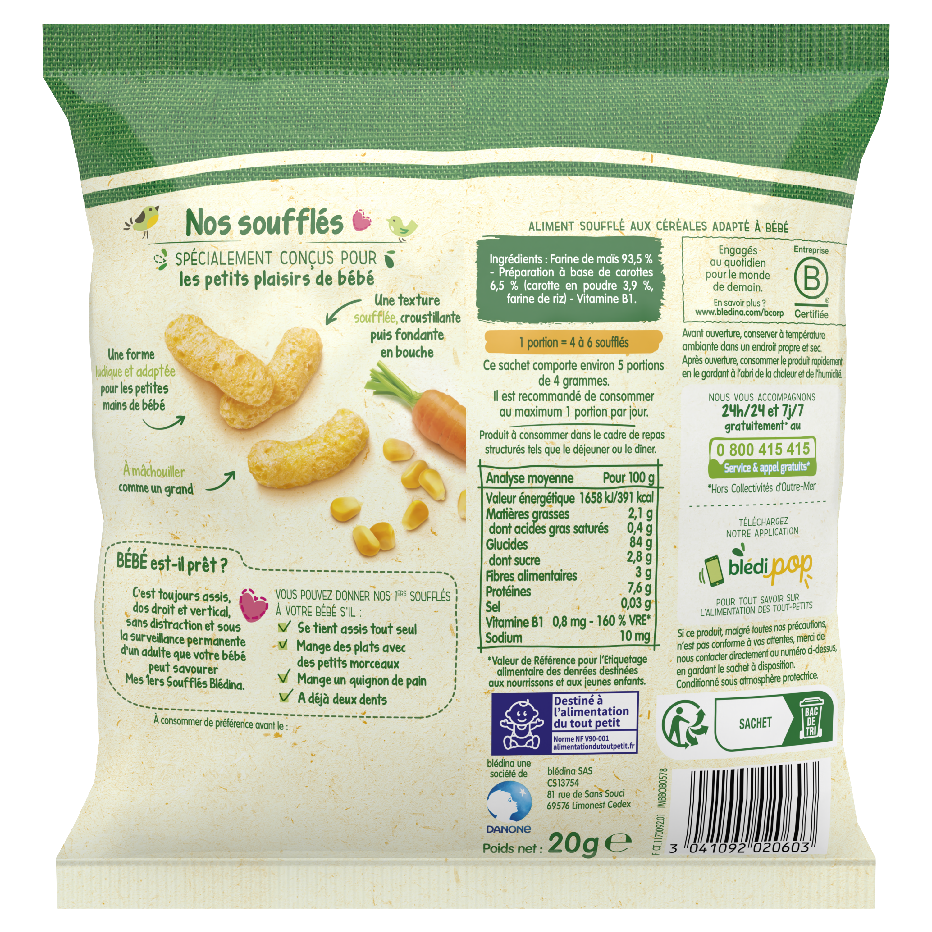 Les soufflés aux céréales de Blédina c'est la gamme spécialement développée pour faire patienter bébé durant la préparation des repas. Découvrez notre assortiment de recettes à la texture soufflée puis croustillante en bouche et à manger avec les doigts pour les petits plaisirs de bébés. C'est toujours assis, le dos à la verticale, sans distraction et sous la surveillance permanente d'un adulte que votre bébé peut savourer les soufflés aux céréales. BÉBÉ est-il prêt ? Vous pouvez donner les soufflés à votre bébé s'il : - sait se déplacer seul - a déjà deux molaires - mange des morceaux plus ou moins fondants - mange un quignon de pain seul Ce lot contient 3 sachets de 20g chacun : 1 X Mes 1ers Soufflés - Maïs Carotte 1 X Mes 1ers Soufflés - Carotte / Butternut Tomate 1 X Crousti à Dévorer- Lentilles corail et Maïs Il est recommandé de consommer au maximum 1 portion par jour (4 à 6 Soufflés Maïs Carottes ; 5 à 7 Soufflés Carotte / Butternut Tomate; 2 à 3 Crousti).