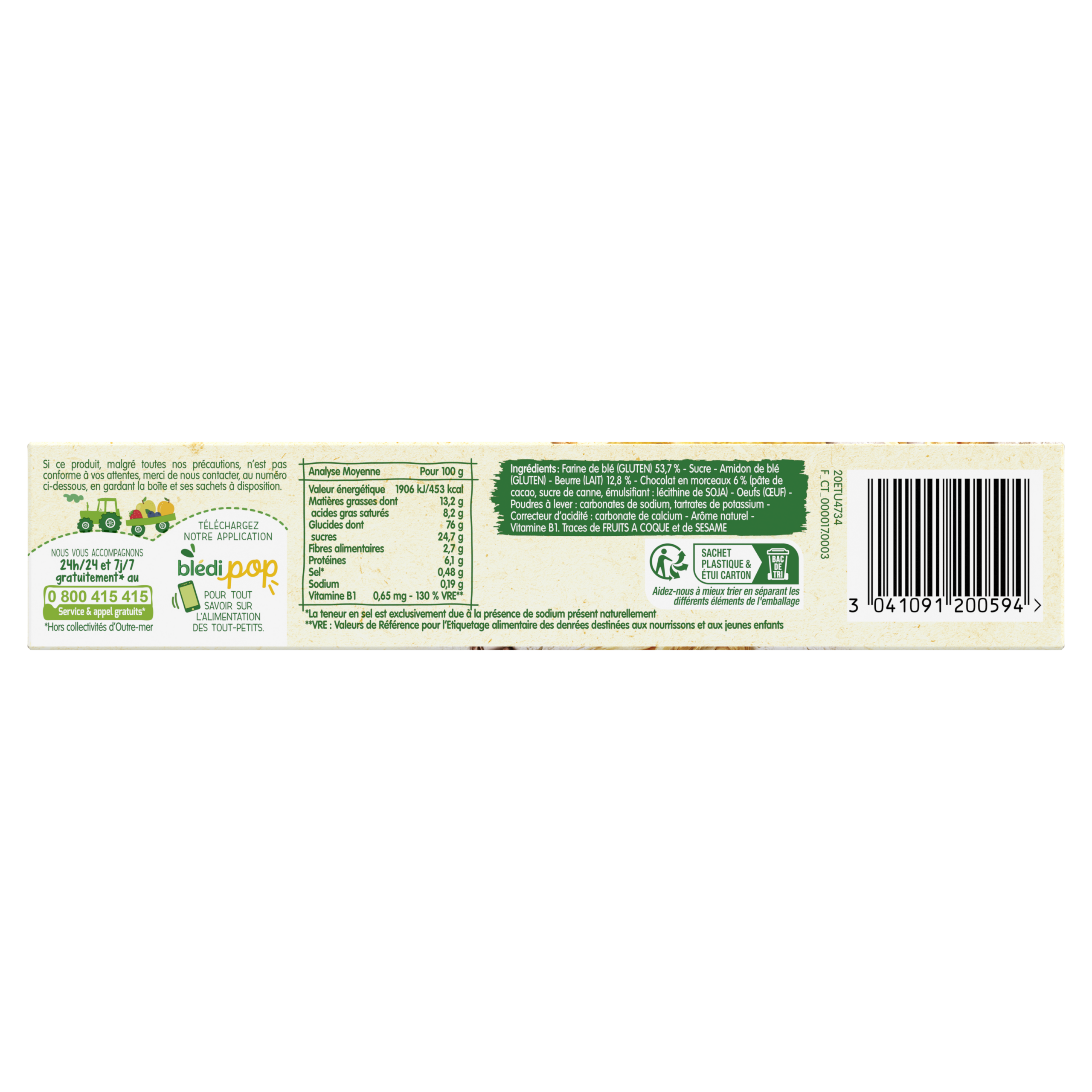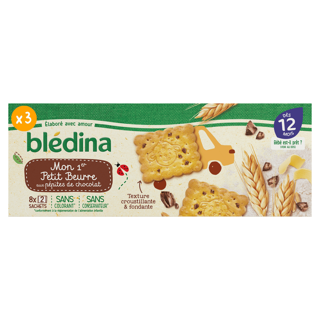 Découvrez Mon 1er Petit Beurre pépites de Chocolat de Blédina : un petit beurre spécialement conçu pour Bébé dès 12 mois (se référer ci-dessous aux détails des informations du produit pour savoir si bébé est prêt), pour un petit-déjeuner ou un goûter gourmand et adapté. Sa texture, croustillante puis fondante en bouche, accompagnera bébé dans la découverte de nouvelles textures. Sans oublier leur touche de chocolat pour encore plus de plaisir ! Texture croustillante puis fondante en bouche Forme idéale pour ses petites mains Format pratique en sachet à emporter partout Lot de 3 packs contenant chacun 8 sachets de 2 biscuits.