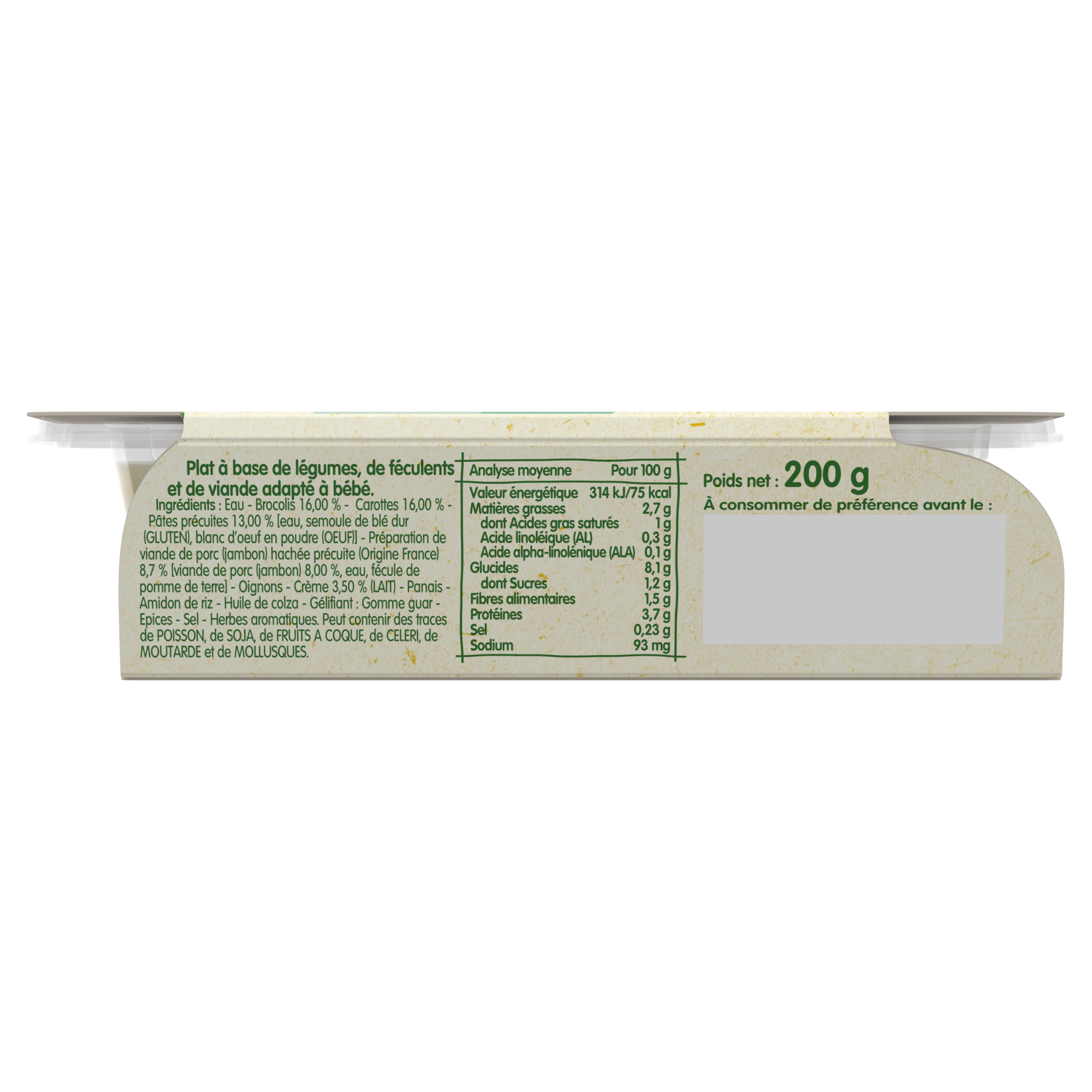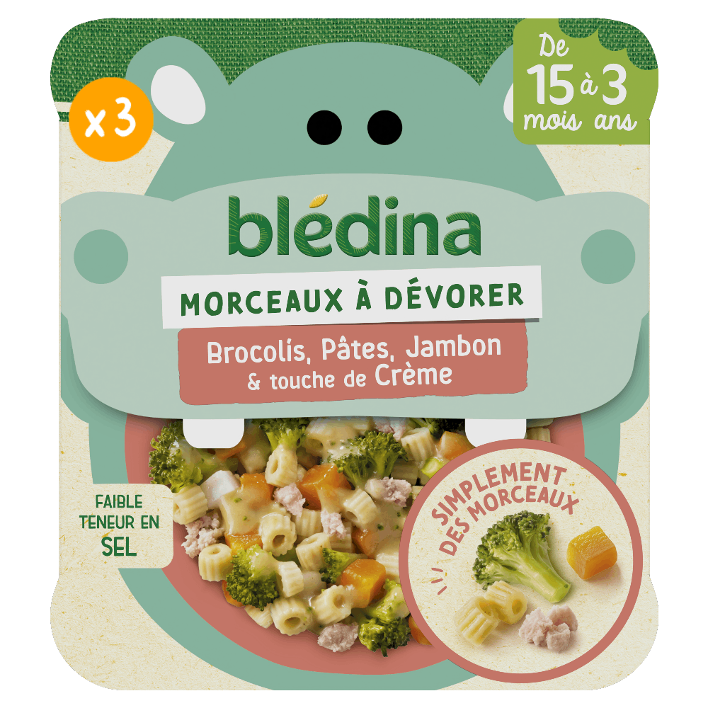Découvrez les petits plats blédina MORCEAUX À DEVORER de 15 mois à 3 ans (se référer ci-dessous aux détails des informations du produit pour savoir si bébé est prêt). Brocolis, Pâtes, Jambon & touche de crème. Un plat complet pour le midi composé d'ingrédients faciles à reconnaître pour apprendre à votre bébé à manger progressivement comme un grand. Aidez le à reconnaitre tous les bons ingrédients de son assiette ! Ce lot contient 3 assiettes de 200g chacun