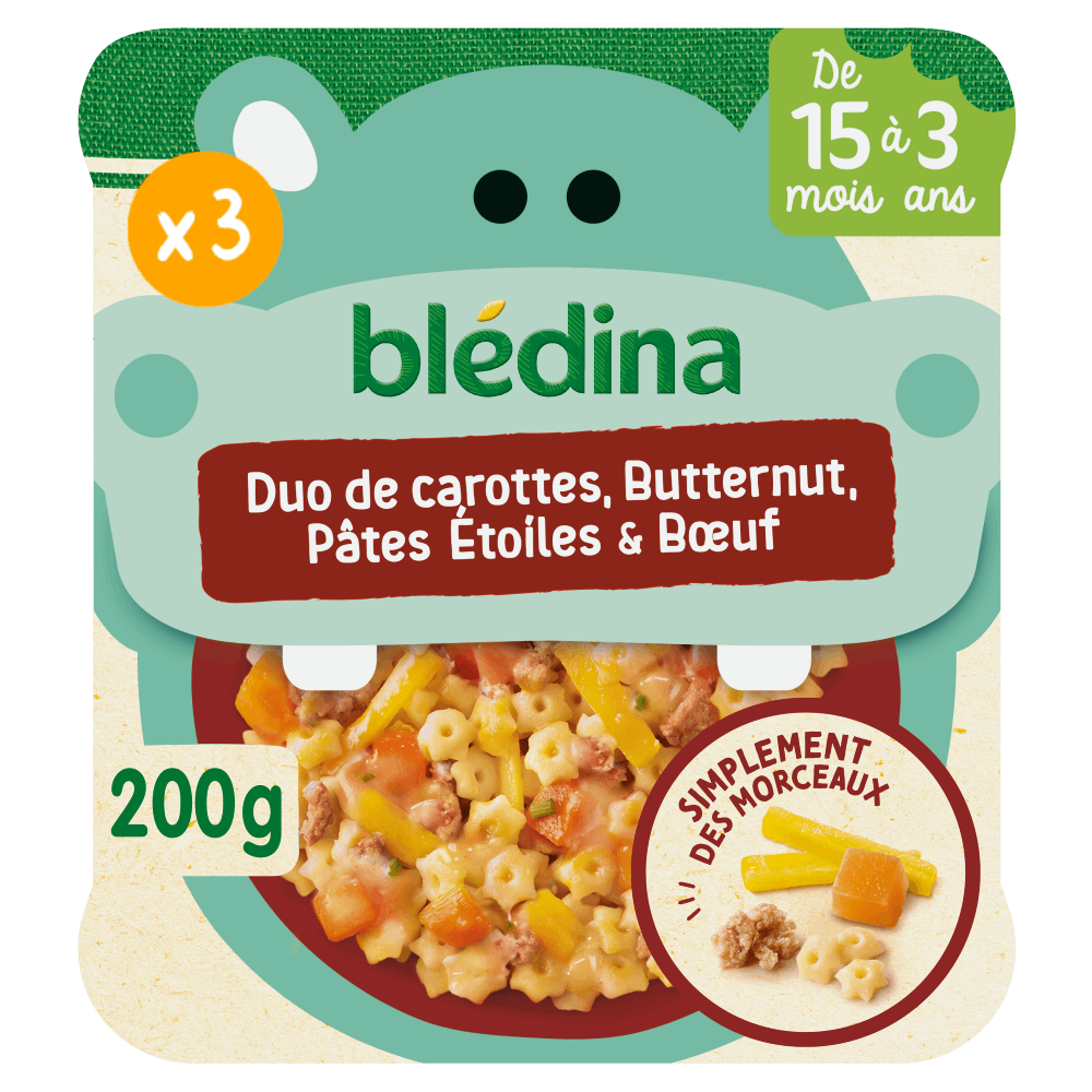 Découvrez les petits plats blédina MORCEAUX À DEVORER de 15 mois à 3 ans (se référer ci-dessous aux détails des informations du produit pour savoir si bébé est prêt).Duo de Carottes, Butternut, Pâtes Etoiles et BœufUn plat complet pour le soir composé d'ingrédients faciles à reconnaître pour apprendre à votre bébé à manger progressivement comme un grand.Aidez le à reconnaitre tous les bons ingrédients de son assiette !Ce lot contient 3 assiettes de 200g chacun