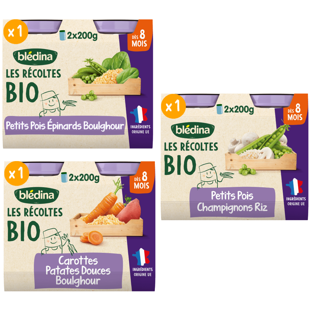 Découvrez nos Petits pots Les récoltes Bio, de délicieuses recettes au bon goût de légumes pour faire découvrir à bébé les petits morceaux. A déguster dès 8 mois pour le dîner. ⠀⠀⠀⠀⠀⠀⠀⠀⠀ Ce lot contient 6 pots de 200g chacun:  2x Les récoltes Bio - Carottes Patates Douces et Boulghour 2x Les récoltes Bio - Petits pois Champignons Riz  2x Les récoltes Bio - Petits pois Epinards Boulghour