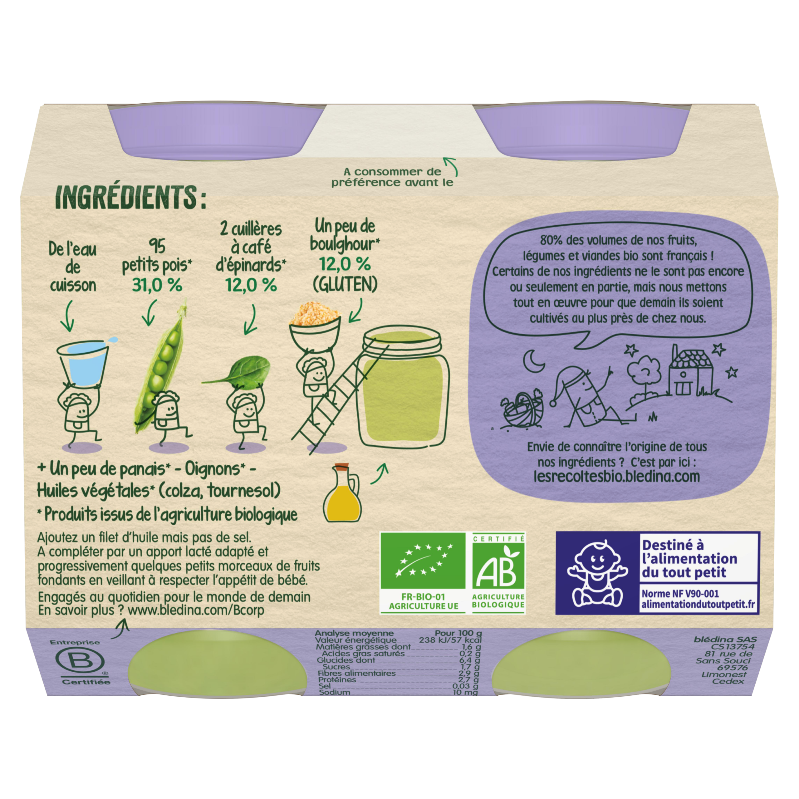 Blédina-Les récoltes bio-Peas Spinach Bulgur-8m+-400 g