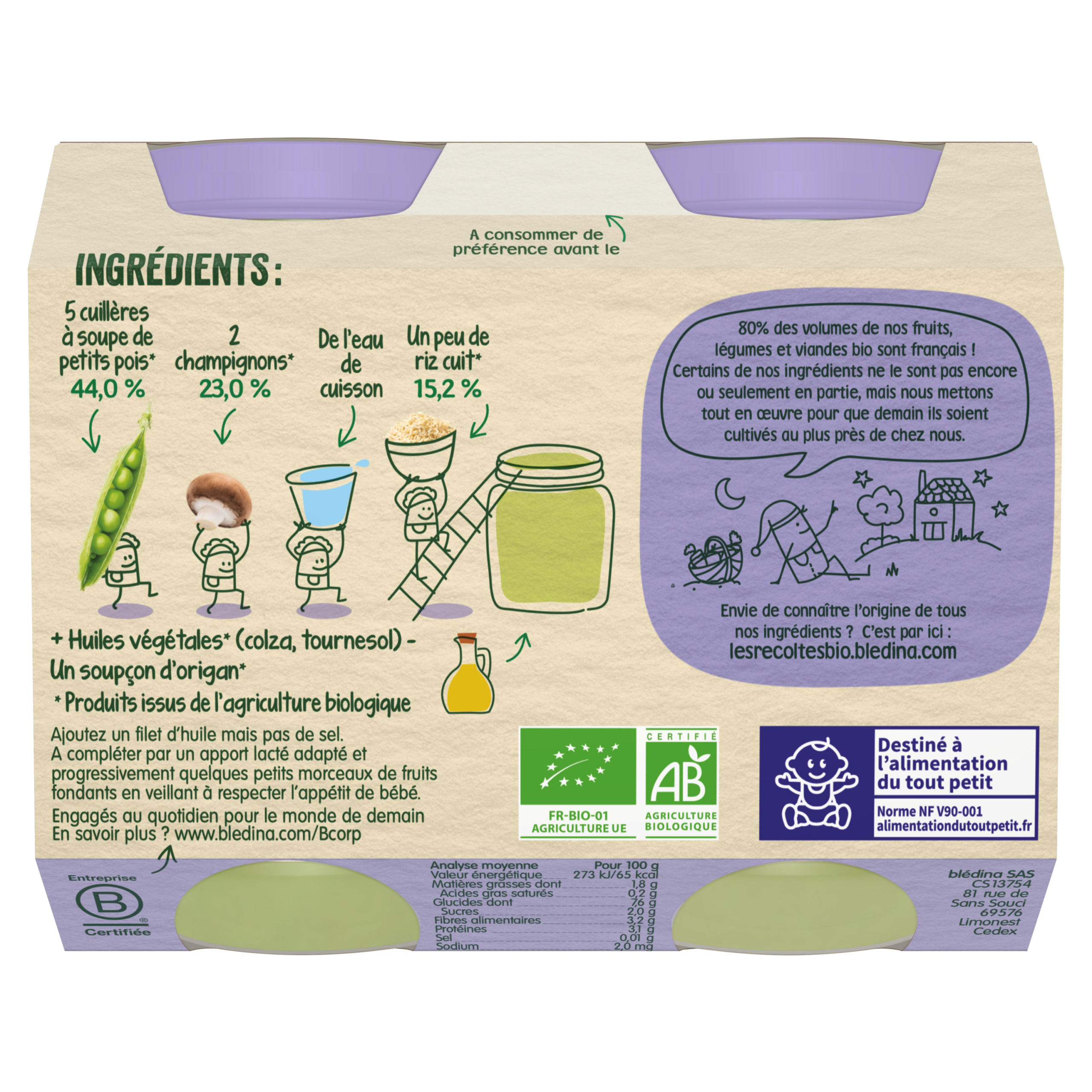 Blédina-Les récoltes bio-Peas Mushroom Rice-8m+-400 g