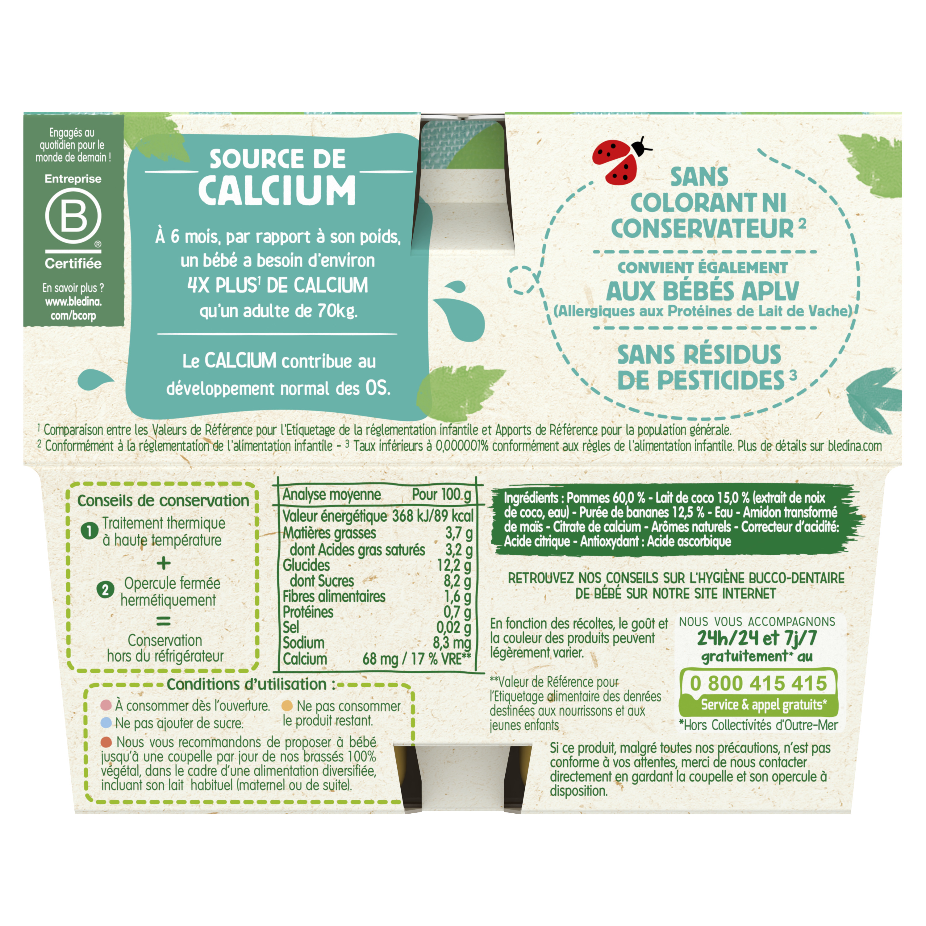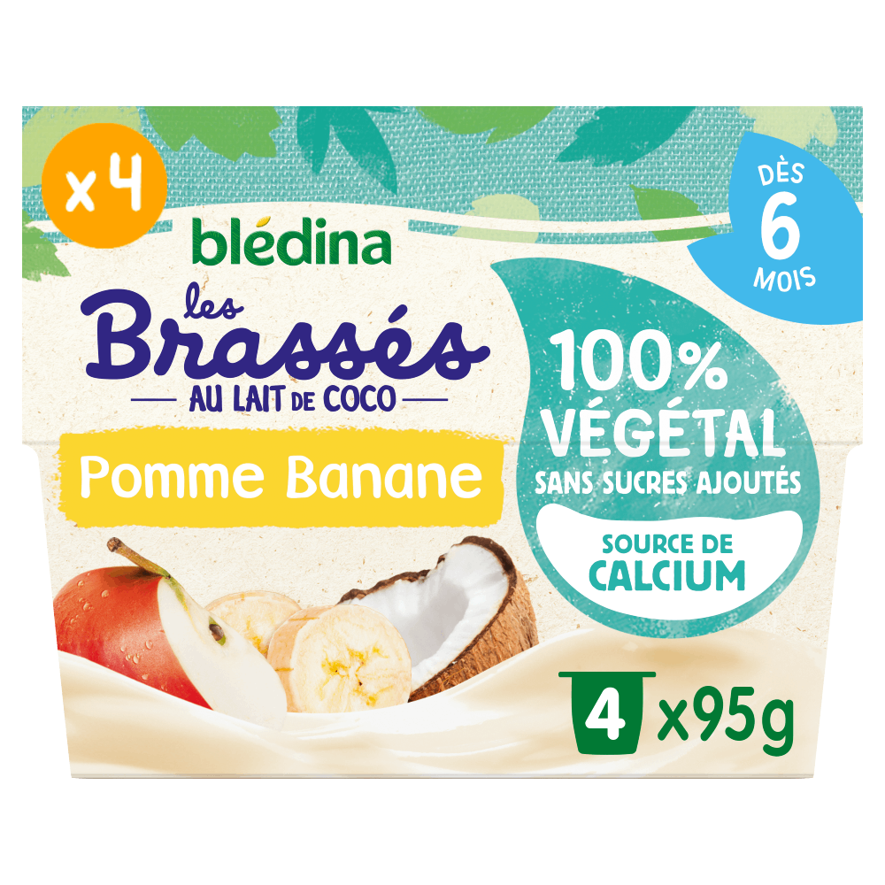 Découvrez les Brassés 100% Végétal : des brassés végétaux Blédina spécialement adaptés à bébé dès 6 mois, au lait de coco, à la pomme et à la banane, sans sucres ajoutés* et source de calcium !Le saviez-vous ? A 6 mois, par rapport à son poids, un bébé a besoin d'environ 4 fois plus** de calcium qu'un adulte de 70kg. Le calcium contribue au développement normal des os. Le petit + ? Convient également aux bébés allergiques aux protéines de lait de vache. *Contient des sucres naturellement présents. **Comparaison Valeur de Référence pour l'Etiquetage selon la réglementation infantile et Apports de Référence pour la population générale. Lot de 4 packs contenant chacun 4 pots de 95g.
