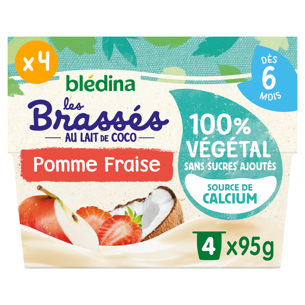 Découvrez les Brassés 100% Végétal : des brassés végétaux Blédina spécialement adaptés à bébé dès 6 mois, au lait de coco, à la pomme et à la fraise, sans sucres ajoutés* et source de calcium ! Le saviez-vous ?  A 6 mois, par rapport à son poids, un bébé a besoin d'environ 4 fois plus** de calcium qu'un adulte de 70kg. Le calcium contribue au développement normal des os.  Le petit + ? Convient également aux bébés allergiques aux protéines de lait de vache. *Contient des sucres naturellement présents. **Comparaison Valeur de Référence pour l'Etiquetage selon la réglementation infantile et Apports de Référence pour la population générale.  Lot de 4 packs contenant chacun 4 pots de 95g.