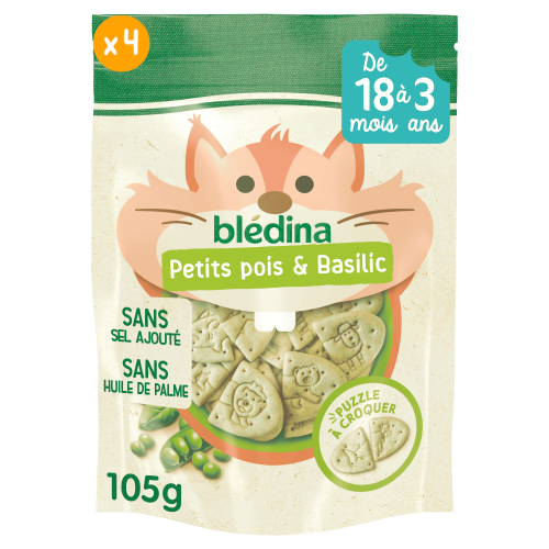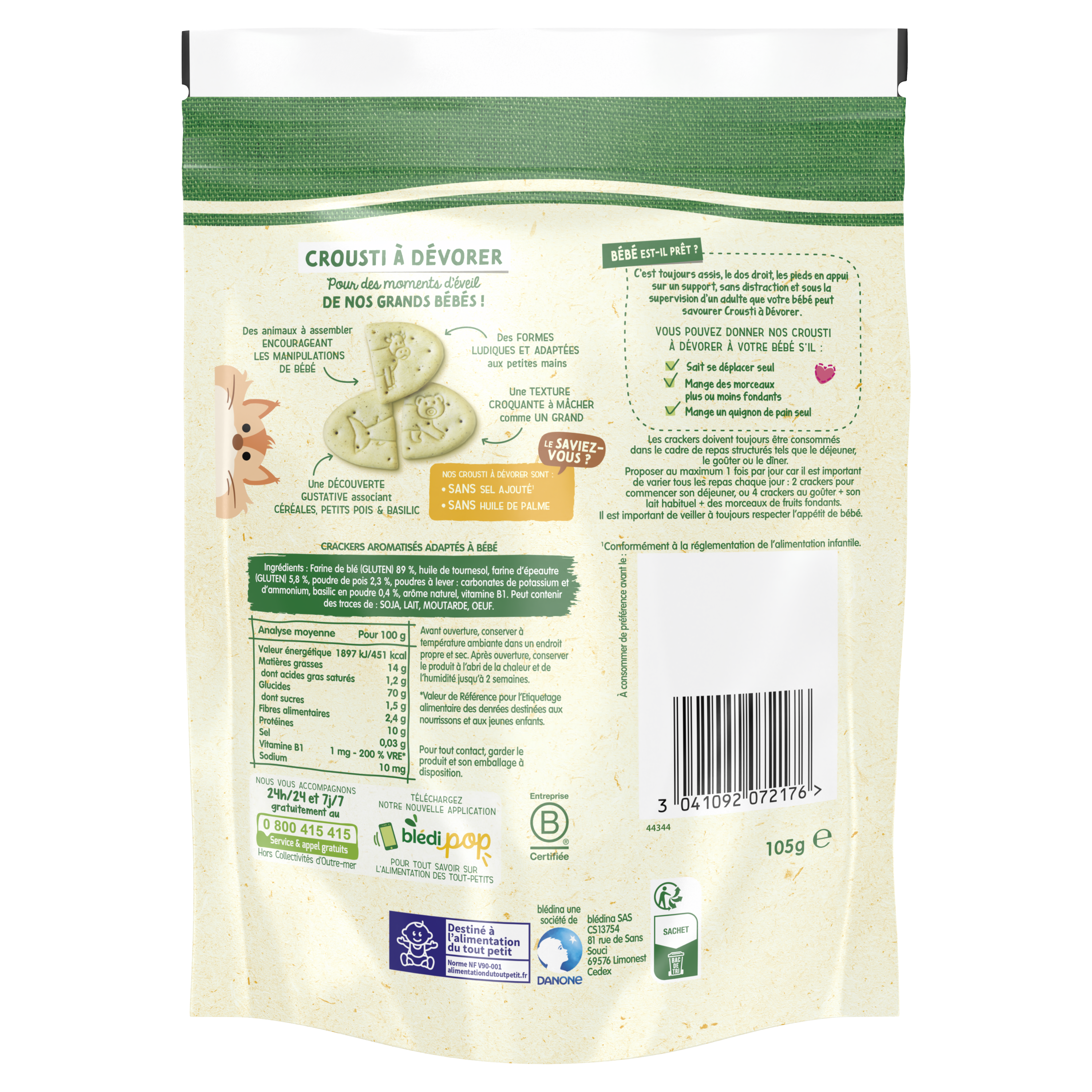 Découvrez les Crousti à dévorer Blédina, la gamme spécialement développée pour faire patienter les grands bébés dès 18 mois (se référer ci-dessous pour savoir si bébé est prêt). Des recettes gourmandes aux céréales et aux légumes à manger avec les doigts pour des moments ludiques.    Les Crousti ont :   - Une forme adaptée aux petites mains de bébé - Un concept de puzzle pour faire patienter bébé et développer sa motricité - Une texture cracker qui fond en bouche  - Un bon goût de céréales, de petits pois et de basilic.    C'est toujours assis, le dos droit, sans distraction et sous la surveillance permanente d'un adulte que votre bébé peut savourer les Crousti à dévorer petits pois et basilic. BÉBÉ est-il prêt ? Vous pouvez donner les Crousti à votre bébé s'il :   - sait se déplacer seul - mange des morceaux plus ou moins fondants - mange un quignon de pain seul    Il est recommandé de consommer au maximum 1 portion par jour (15g).    Ce lot contient 4 sachets de 105g chacun.