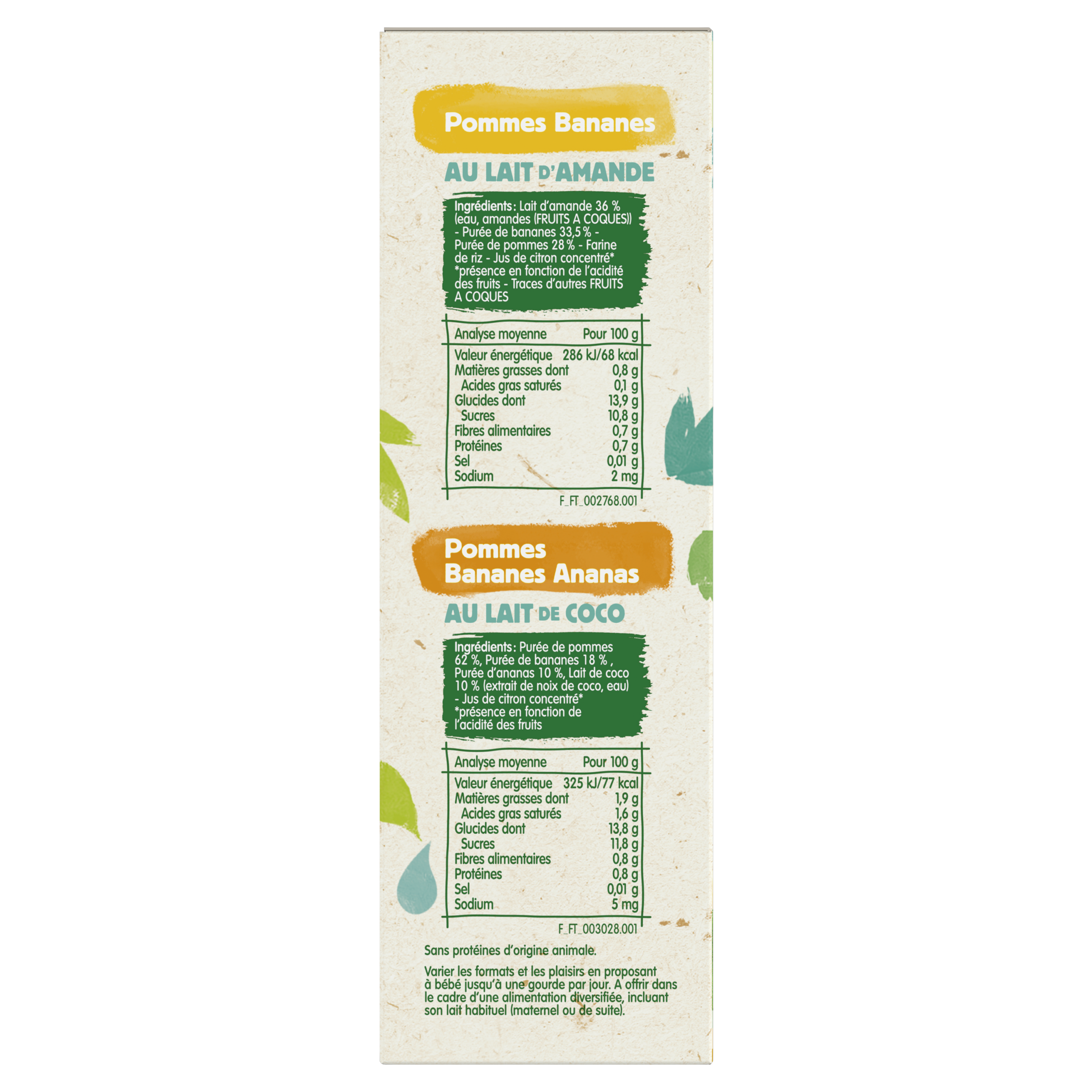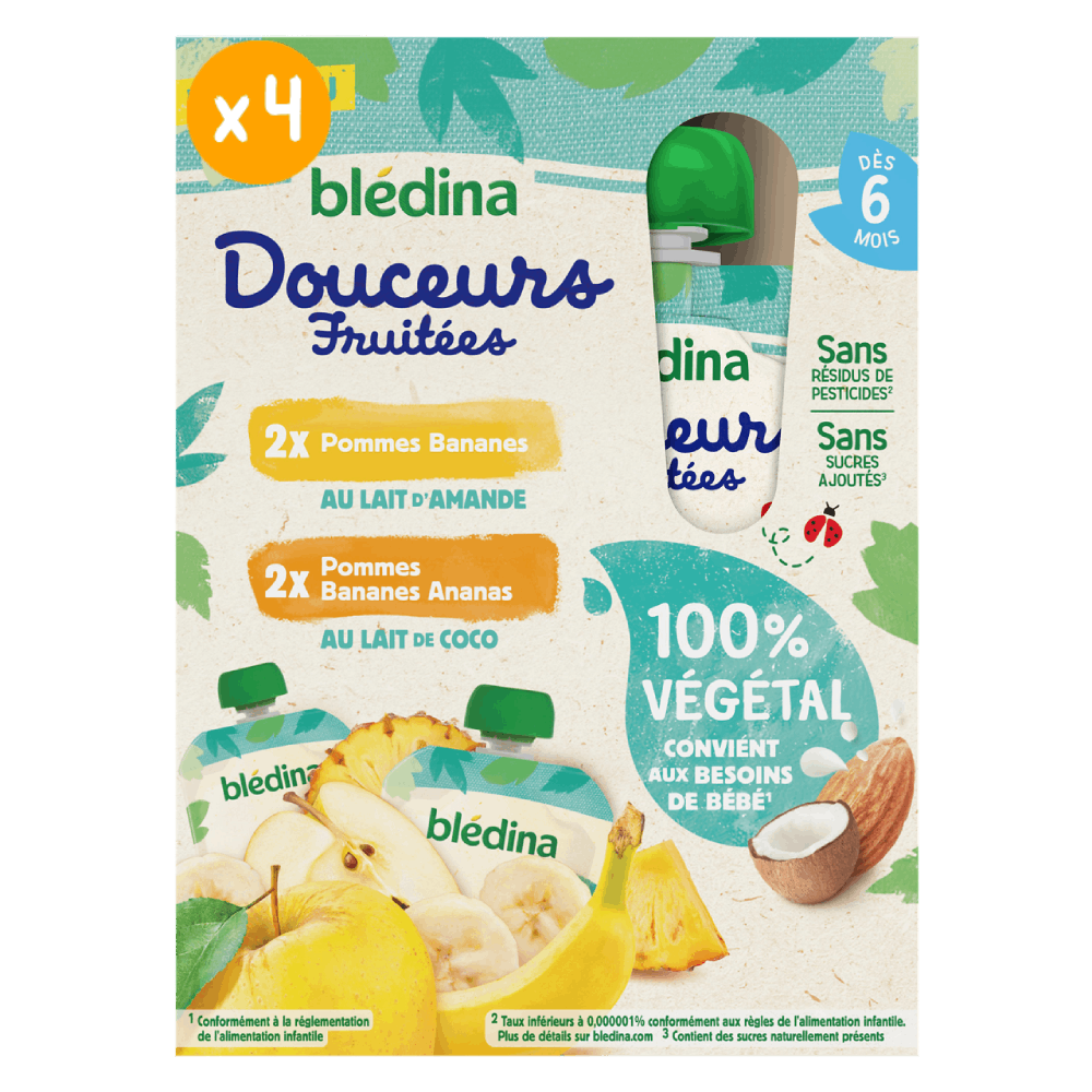 Découvrez les Gourdes Fruitées 100% Végétal : des purées de fruits végétales Blédina adaptées à bébé dès 6 mois. Initiez bébé aux saveurs 100% végétal grâce à l’association du lait de coco ou du lait d’amande à de savoureuses purées de fruits dans les Gourdes Douceurs Fruitées 100% Végétal ! Format pratique en gourde à emporter partout Sans protéines d’origine animale Convient également aux enfants allergiques aux protéines de lait de vache Ce lot contient 4 packs de 4 gourdes de 90g chacune. 8x Pommes Bananes au Lait d'Amande 8xPommes Bananes Ananas au Lait de Coco